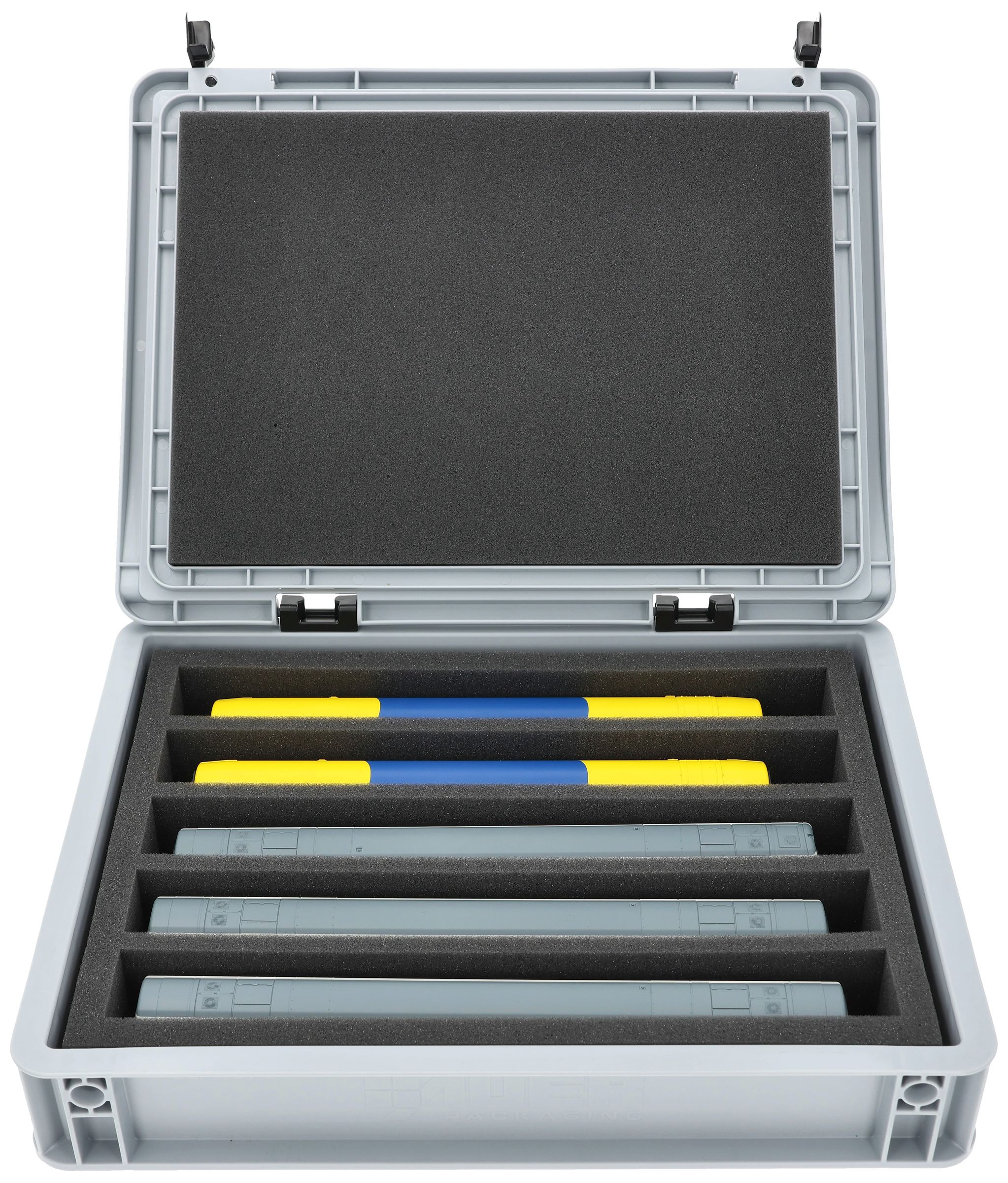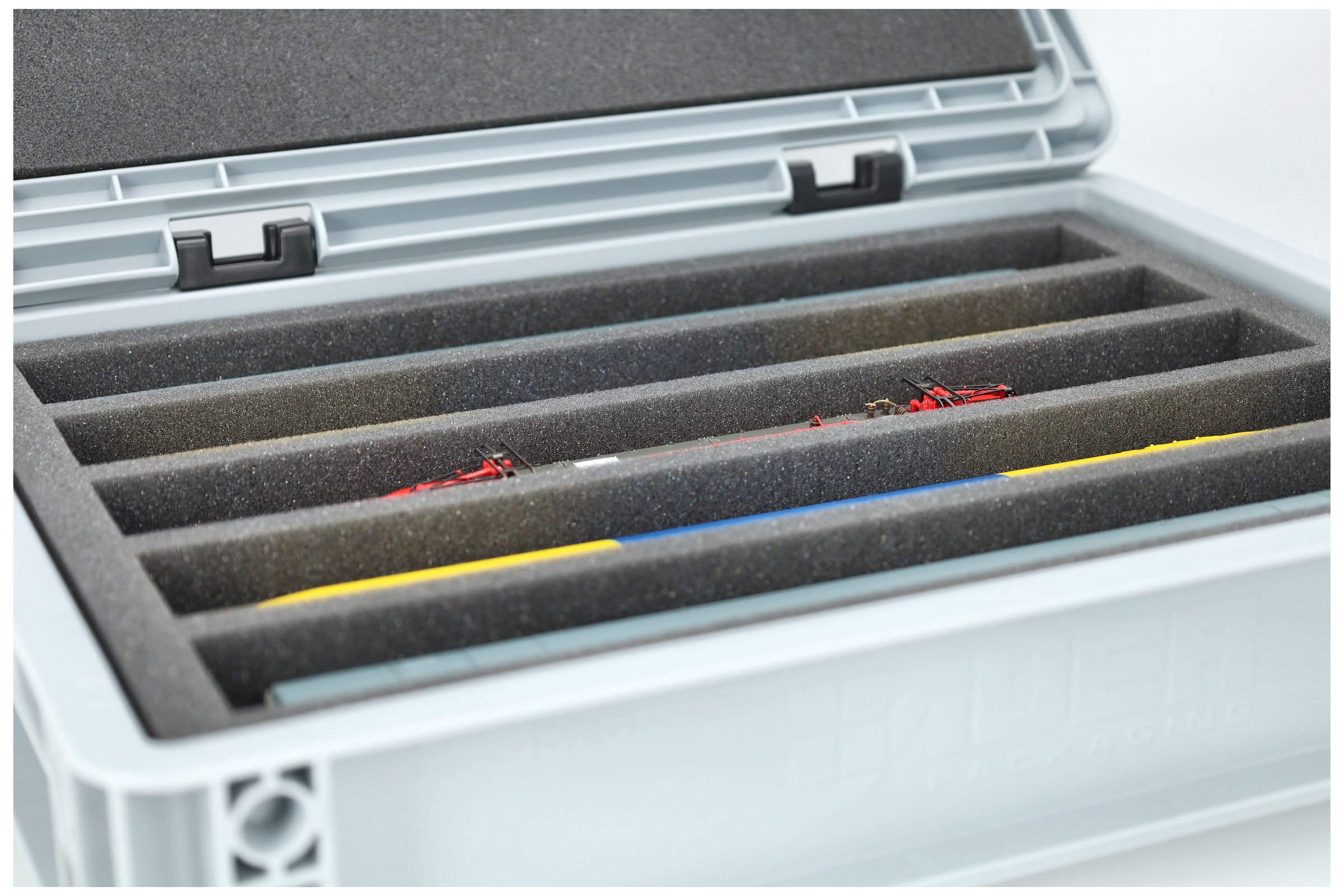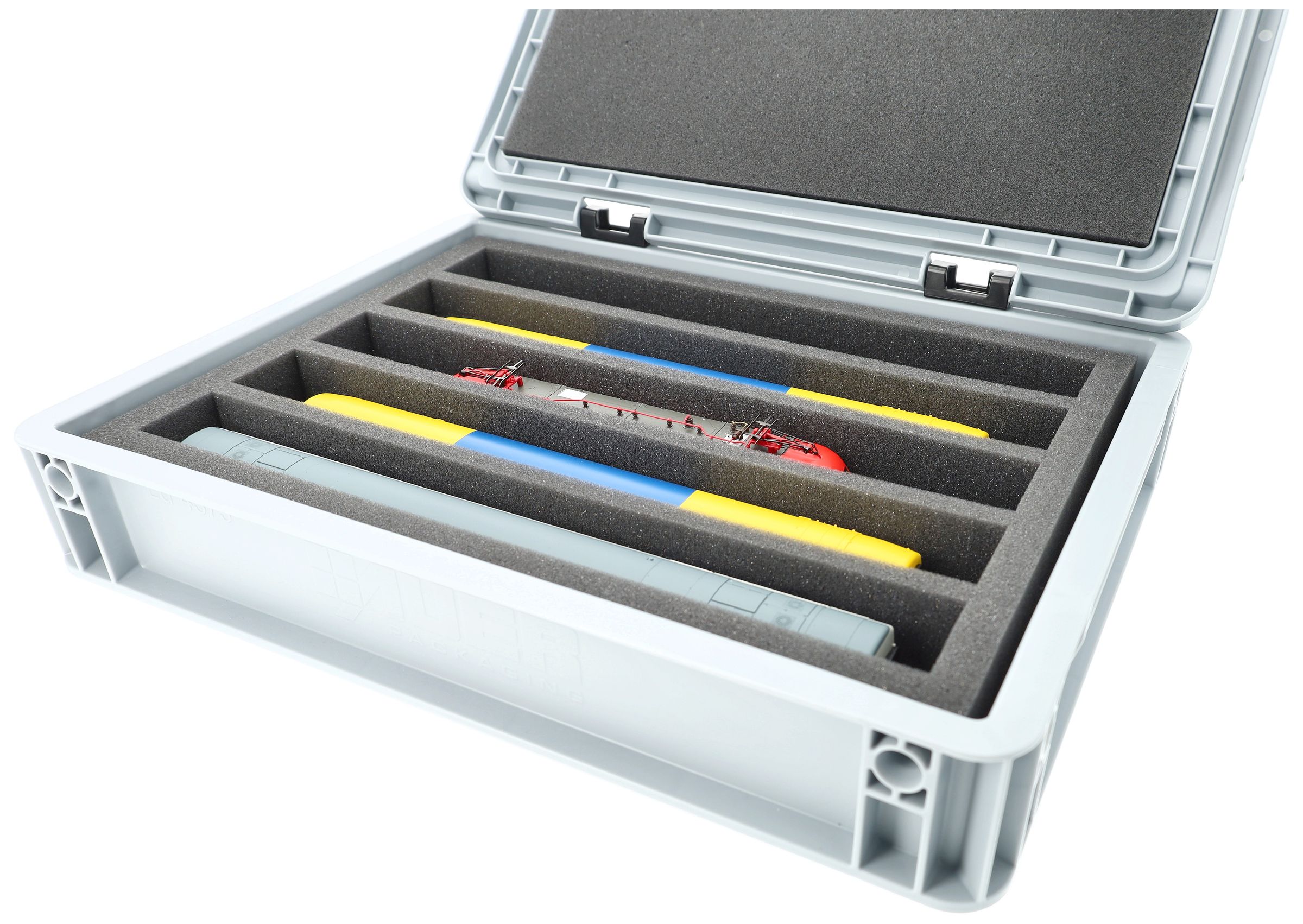 The fine-pored foam reliably protects sensitive details, paintwork, and attachments on your models from scratches and damage. The sturdy Eurobox made of shock-resistant plastic provides additional protection from external influences. A simple hinge system with two locks keeps the box securely closed and protects the contents from dust and dirt.