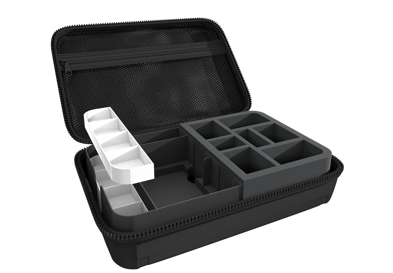 The included foam topper is placed on top to prevent game material from falling out of the compartments during transport.