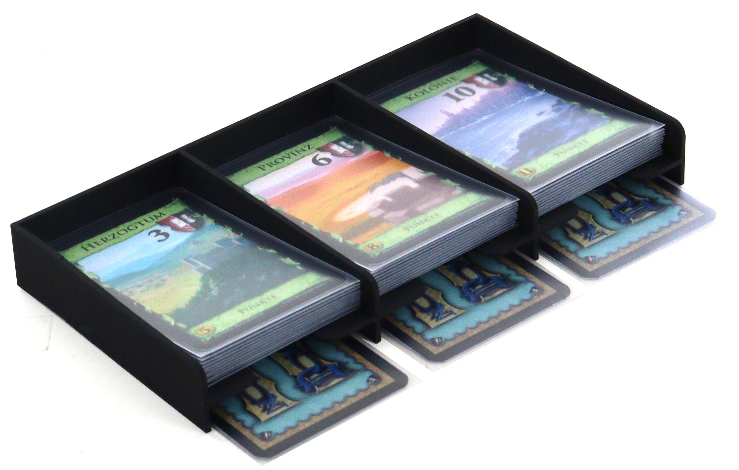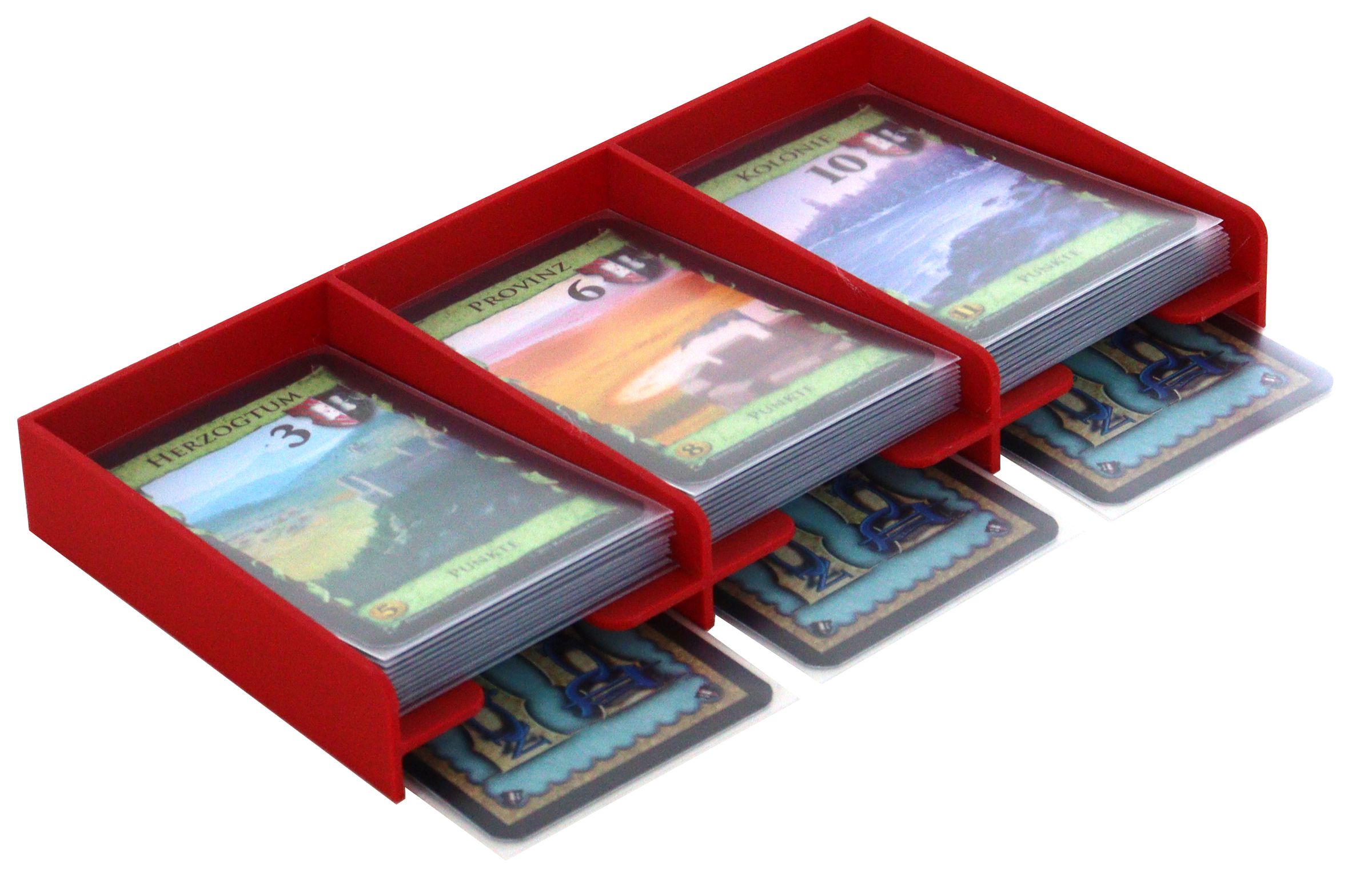 This Feldherr card holder helps to keep the tabletop tidy. Three compartments for your draw pile, discard pile, or "need to be sorted" pile allows you to sort your cards quickly. Compactly designed, the tray occupies only a little space on the gaming table, allowing you to place additional cards underneath the card compartments. With the Feldherr card holder, you can fully concentrate on the game and easily dominate Dominion.