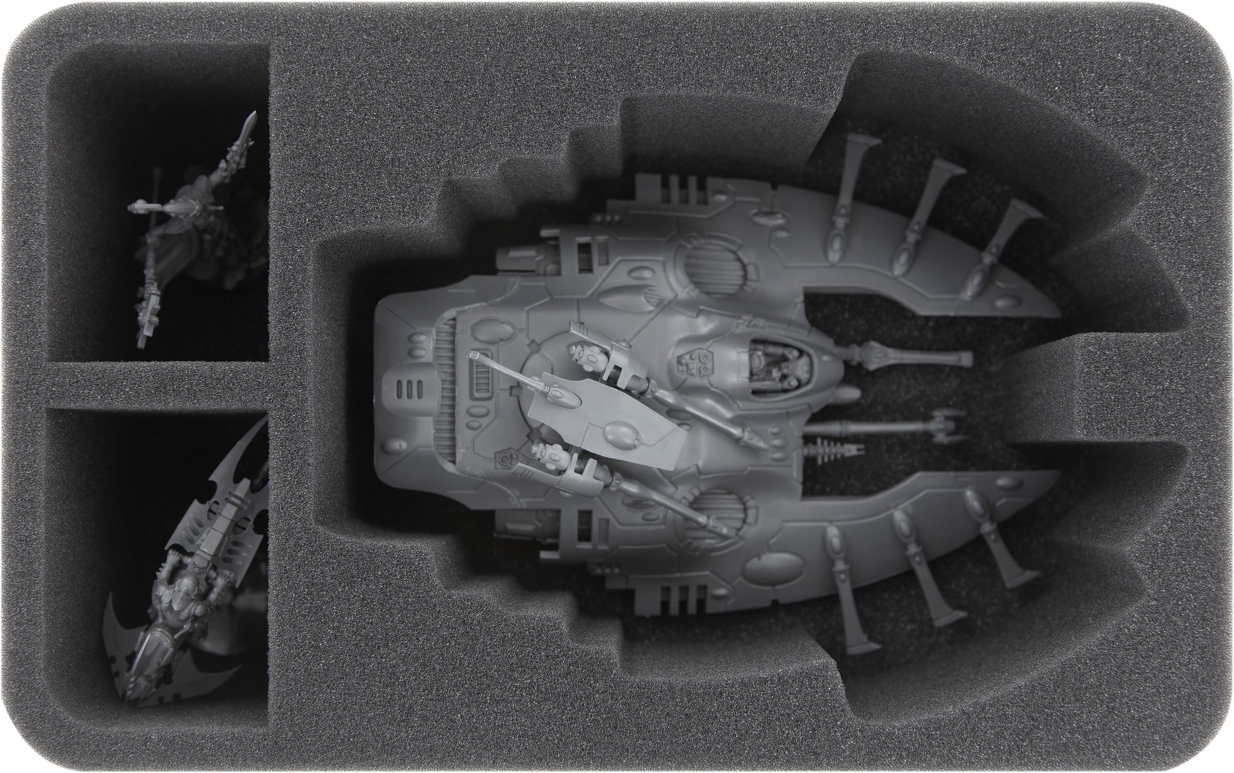 The two foam trays for the Antigrav vehicles feature a custom cut compartment which can either hold a Wave Serpent troop carrier or a Falcon battle tank. Thanks to the precisely fitting cut, the models enjoy the best possible protection. Sensitive details such as the Shuriken Cannon or the Pulselaser will remain unharmed even during transport.