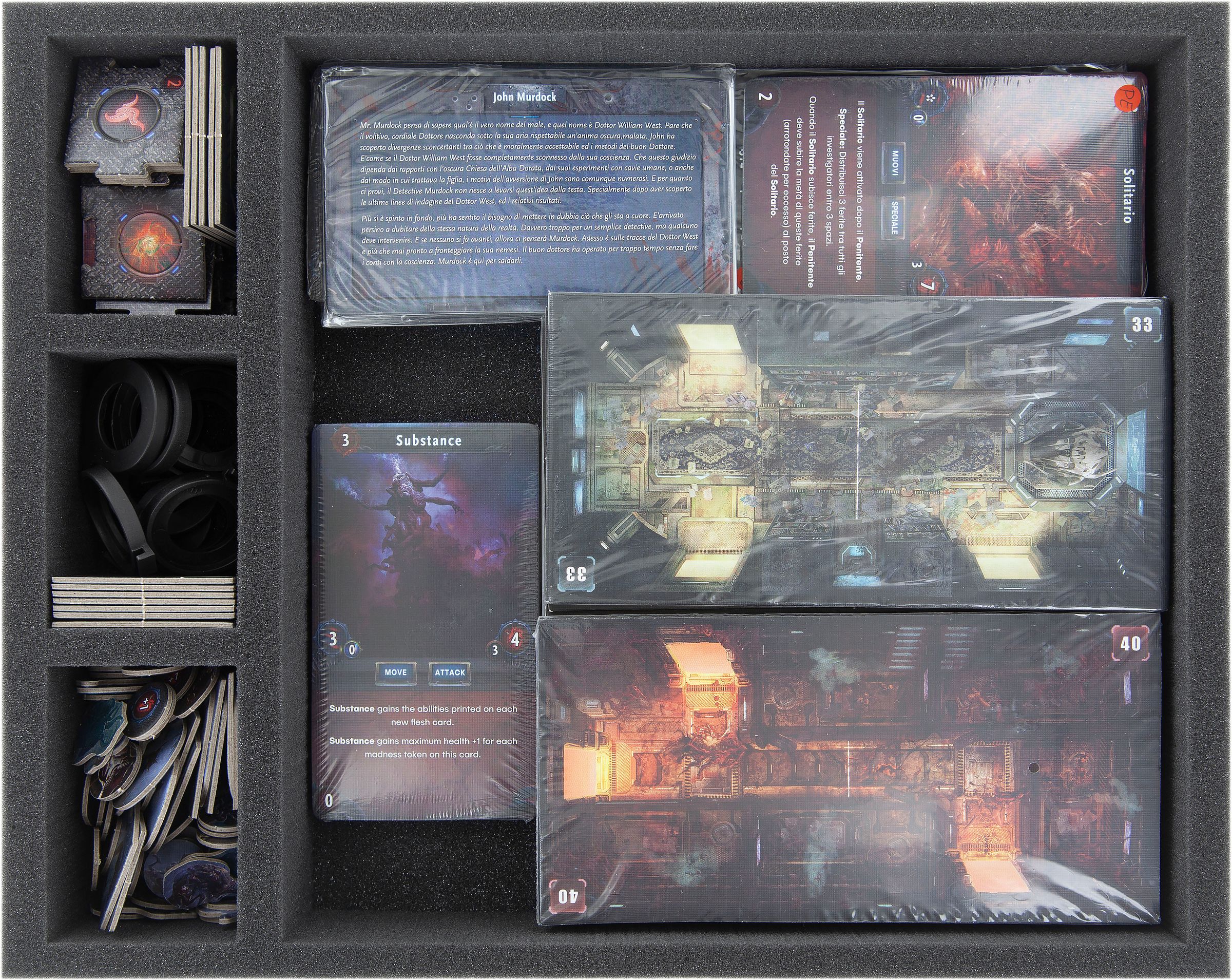 So that you don’t descend into madness when attempting to sort and store your game material, Feldherr assembled a Double-Size storage box with the matching foam trays for "Deep Madness“.