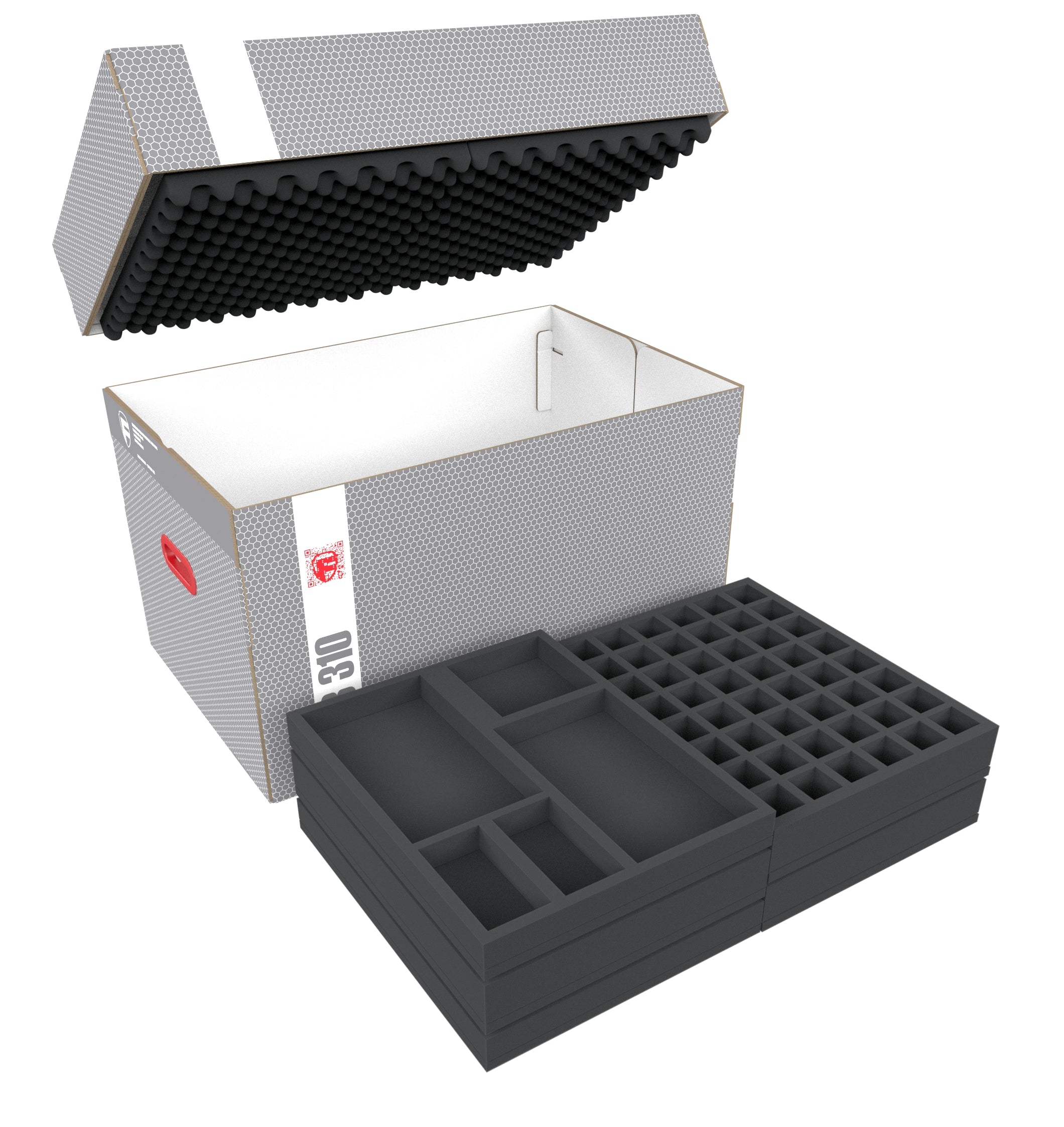 Two convoluted foams and one foam topper complete the set. The foam topper serves for leveling the tray stacks in the storage box, the convoluted foams serve as covers to ensure that nothing can fall out of the uppermost trays.