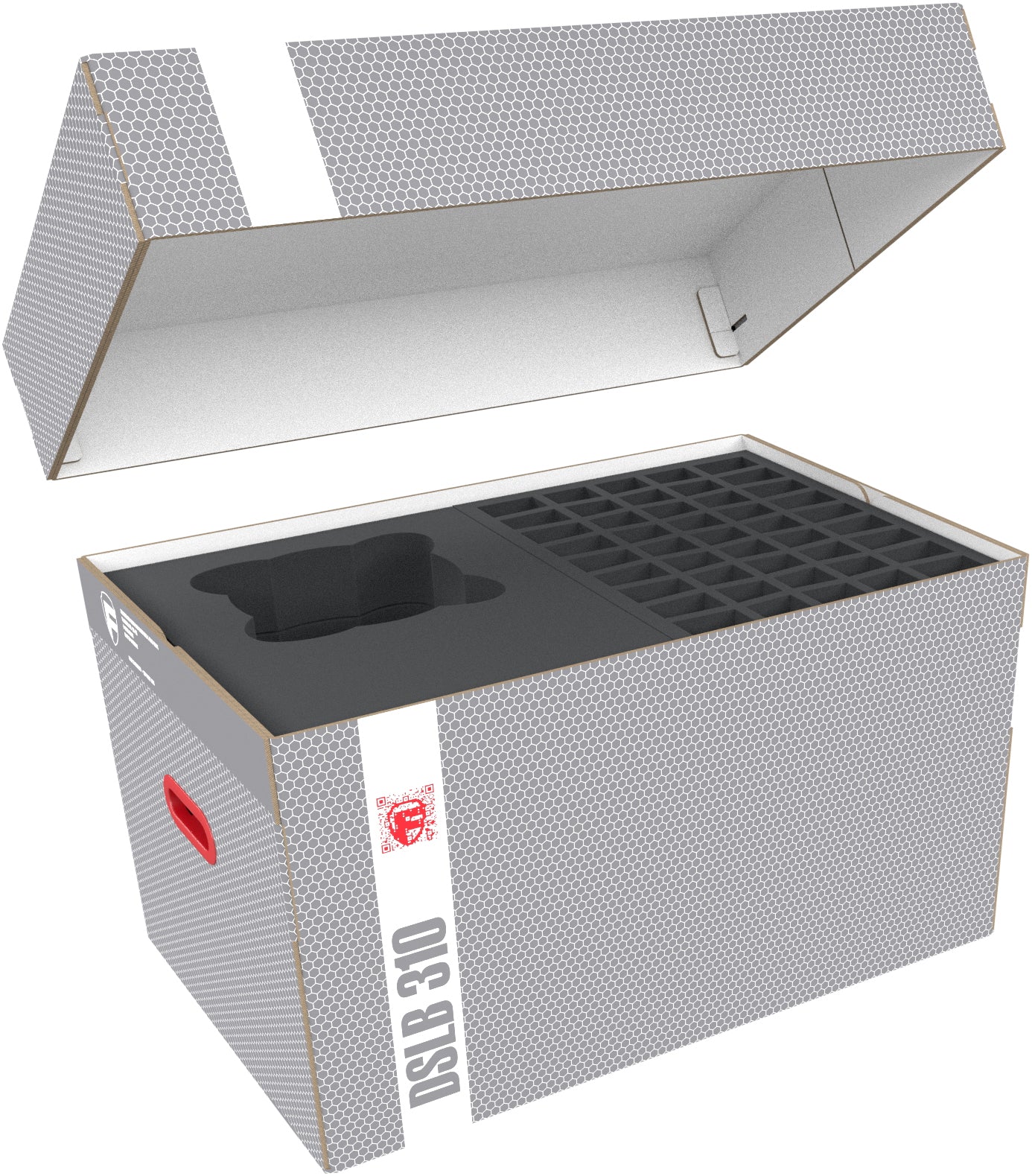 The Double-Size storage box is made of coated, double-walled cardboard, It is therefore both very light and very stable. The attachable lid reliably protects your miniatures from dust and other external influences. With the two plastic-reinforced carrying handles on the sides, you can transport the box very easily.