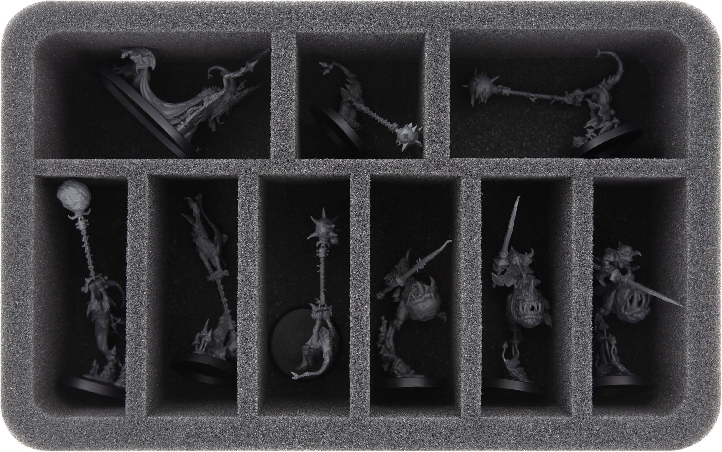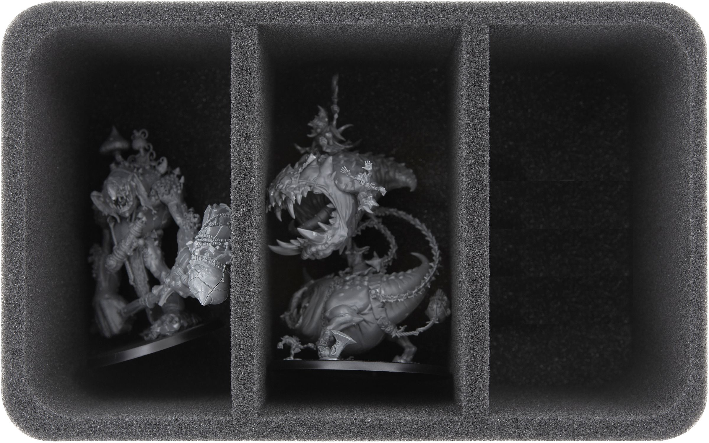 The two foam trays for the large models have 3 compartments each. The tray is ideally suited for miniatures like Dankhold Troggoth (also as Boss-variant), Gargants, or Mangler Squigs.