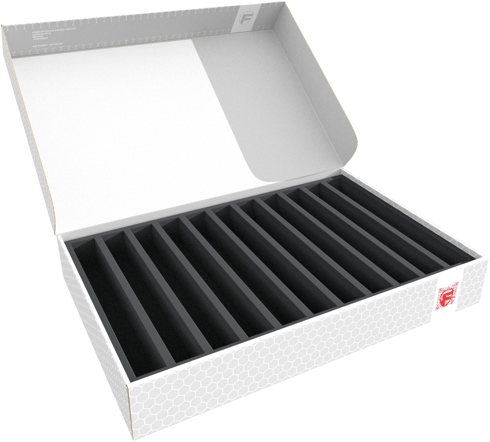 The inlay fits perfectly into the Feldherr Storage Box DSLB075. The box is made of coated, double-walled cardboard. This makes it not only pleasantly light, but also particularly tear-resistant and stable. The models can be stored safely and protected against dust and other external influences. Thanks to the flat, compact form, they are easy to transport.