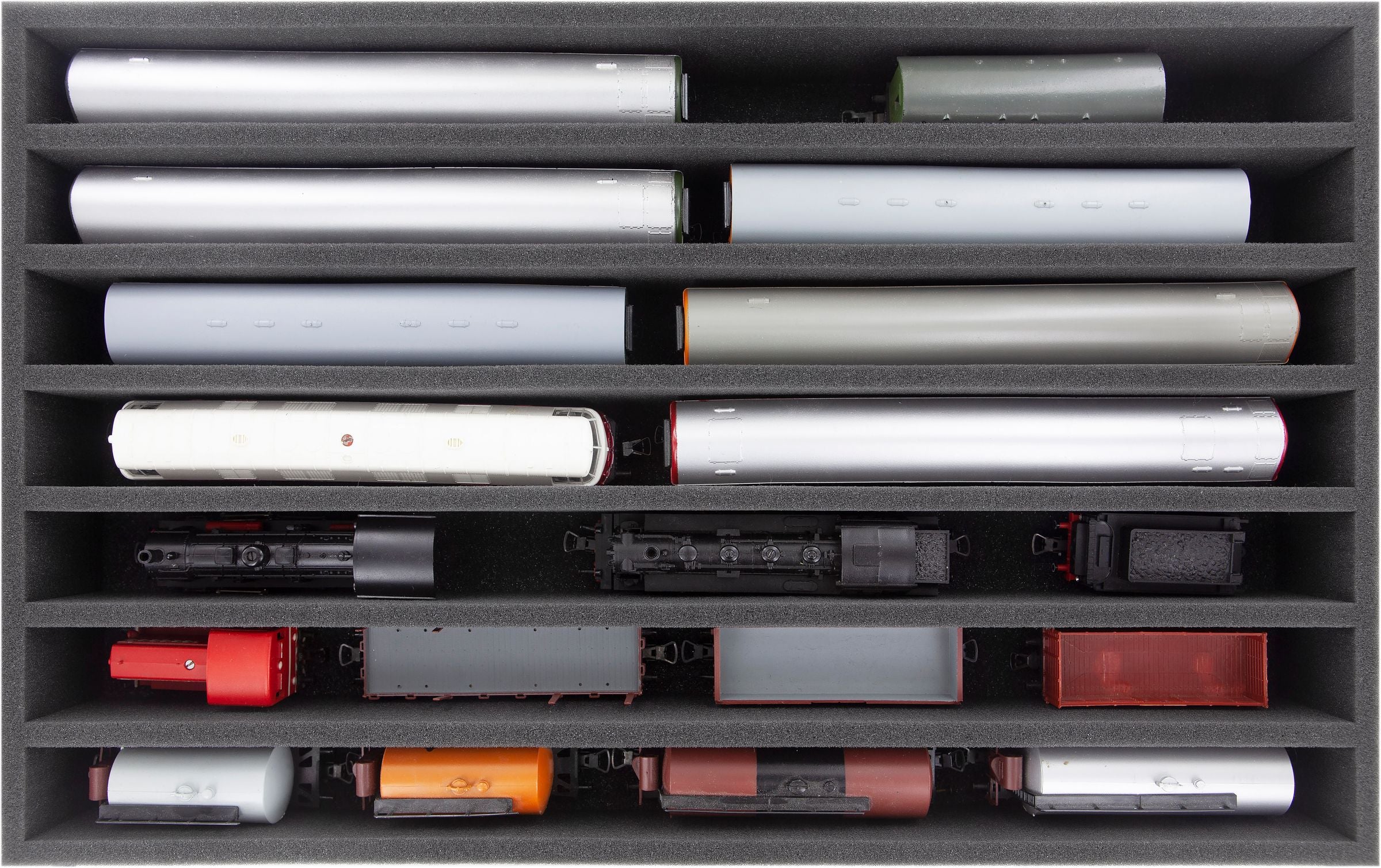 Seven compartments, tailor-made for upright storage of model railways in Gauge H0, offer your wagons and locomotives reliable protection for storage and transport.