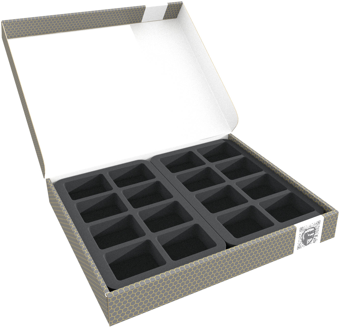 - 2 Half-Size foam trays with 8 compartments each for Adeptus Astartes Xiphon Interceptors, Adeptus Astartes Storm Eagles, Asuryani Nightwings, Asuryani Phoenix Bombers, Bases, Flying Rods, Tokens, and Dice (HS035BF02BO)