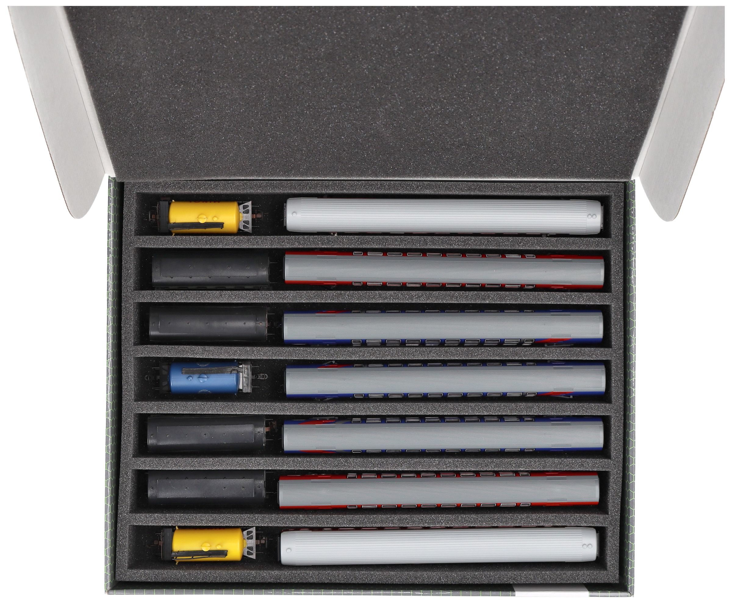 Several trains and carriages can be stored next to each other in one compartment. In order to prevent collision or unintentional coupling, we offer suitable foam spacers (HS040A003).
