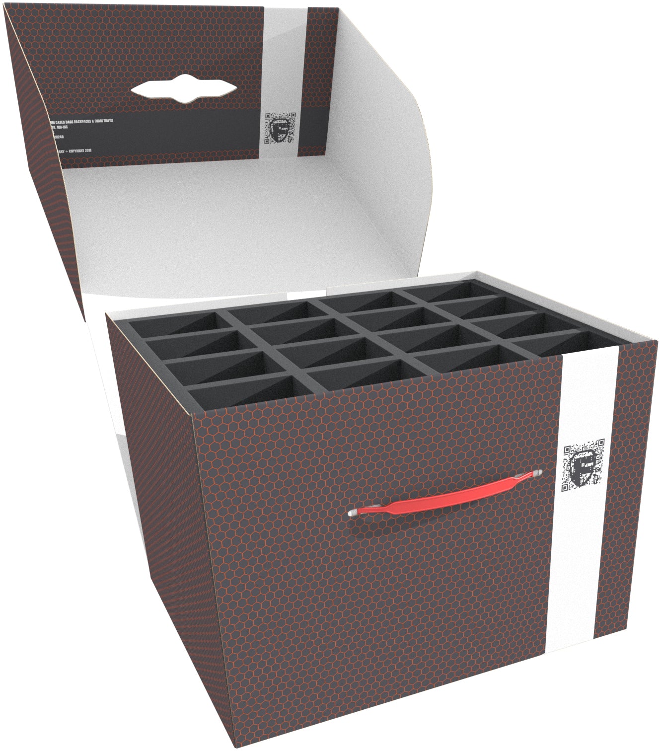 The Storage Box FSLB250 is made of coated, double-walled cardboard and is, therefore, on the one hand, very light and also exceptionally stable. The practical carrying handle makes it easy to transport the box. You can open one side of the box completely. This makes it easier to put away and take out the foam inserts.