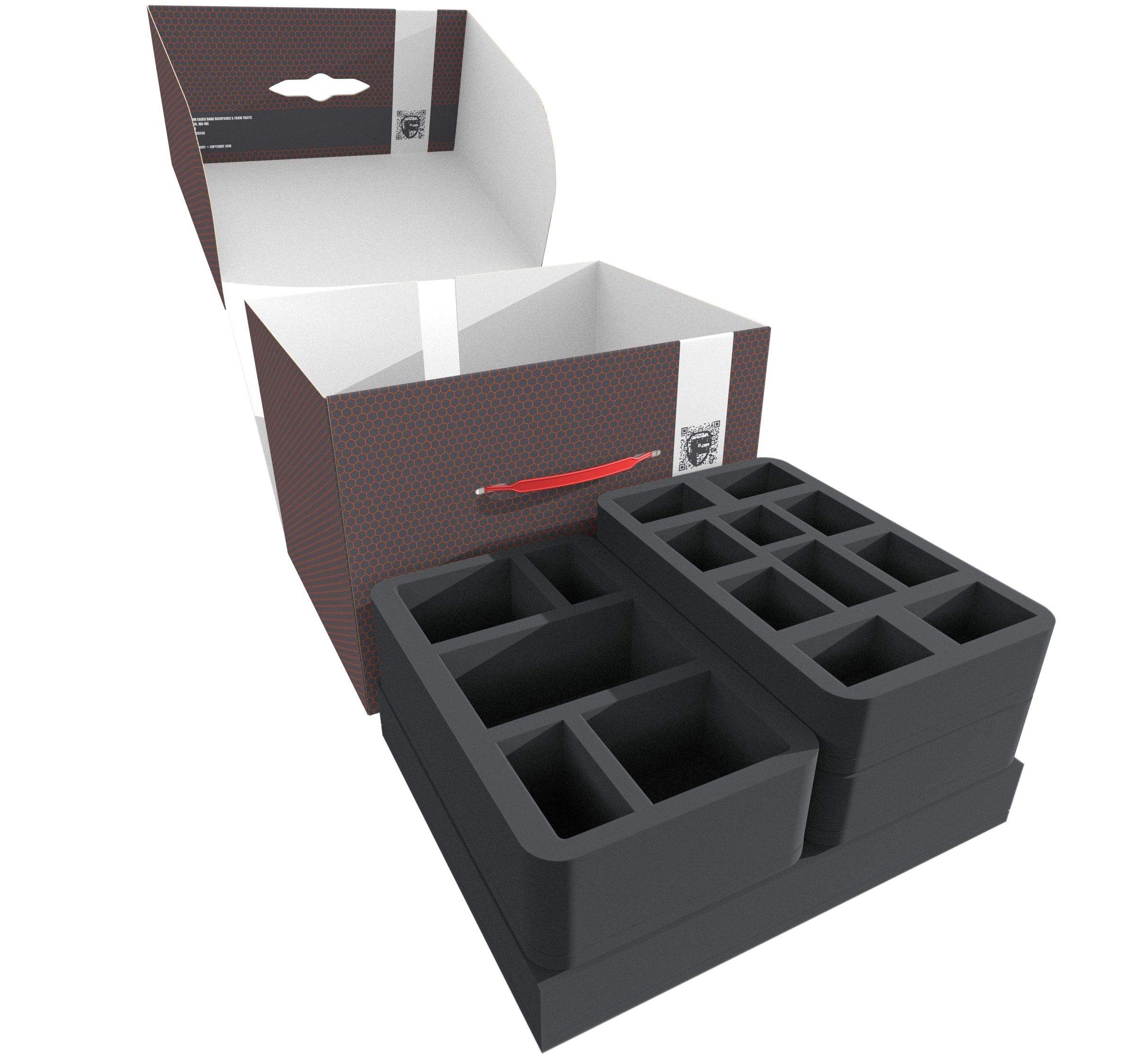 The Storage Box FSLB250 is made of coated, double-walled cardboard. This makes it not only pleasantly light but also particularly tear-resistant and stable. With the matching foam trays, miniatures and game material can be stored safely and dust-protected and can also be transported effortlessly with the plastic carrying handle. To make it easier to store and remove the foam mats, one side of the box can be opened completely. The trays are either inserted from above or simply slid into the box from the side.