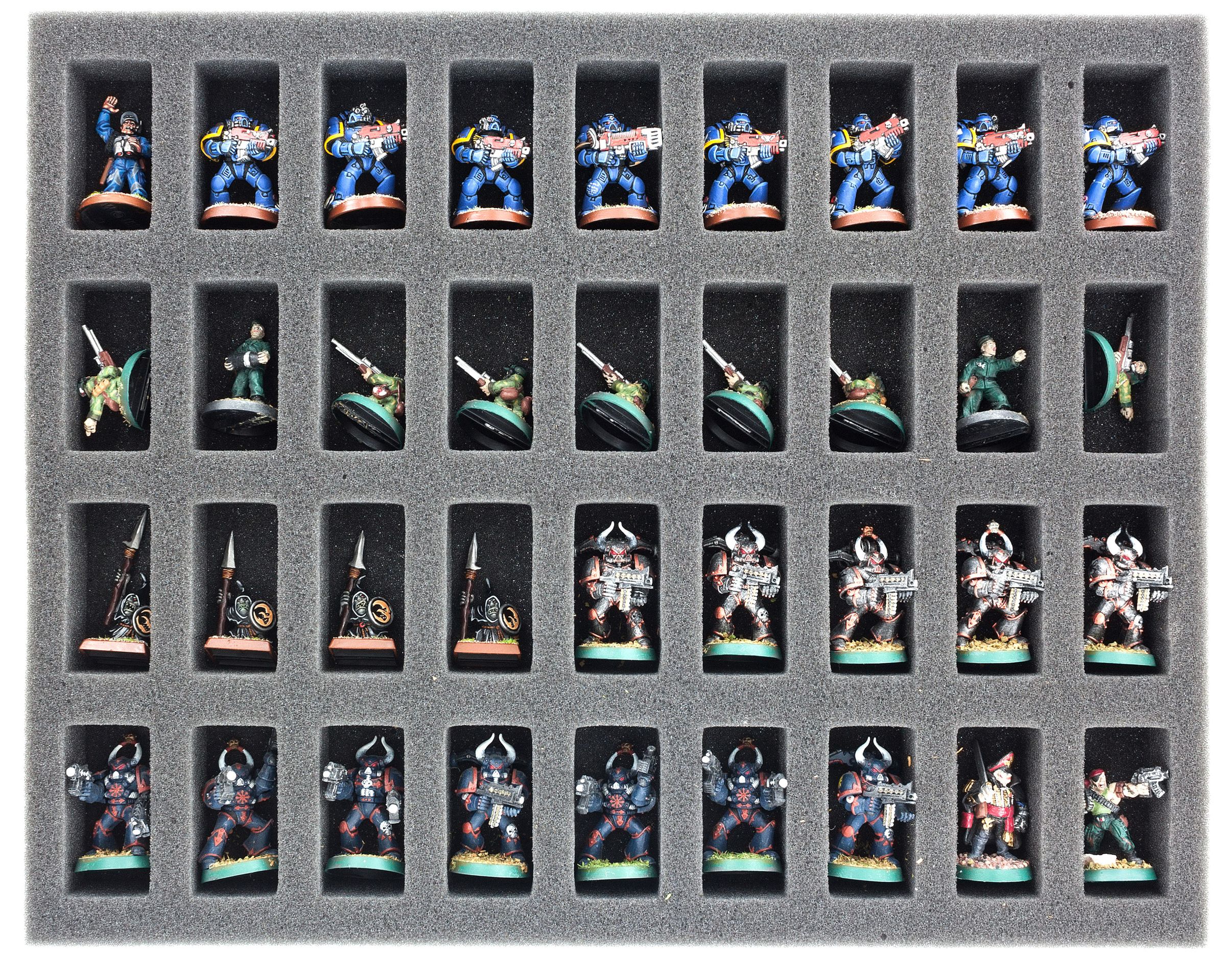 35 mm standard trays each with 36 compartments: Particularly suitable for neat and safe storage of common infantry and other board game and tabletop miniatures on 25 mm bases.