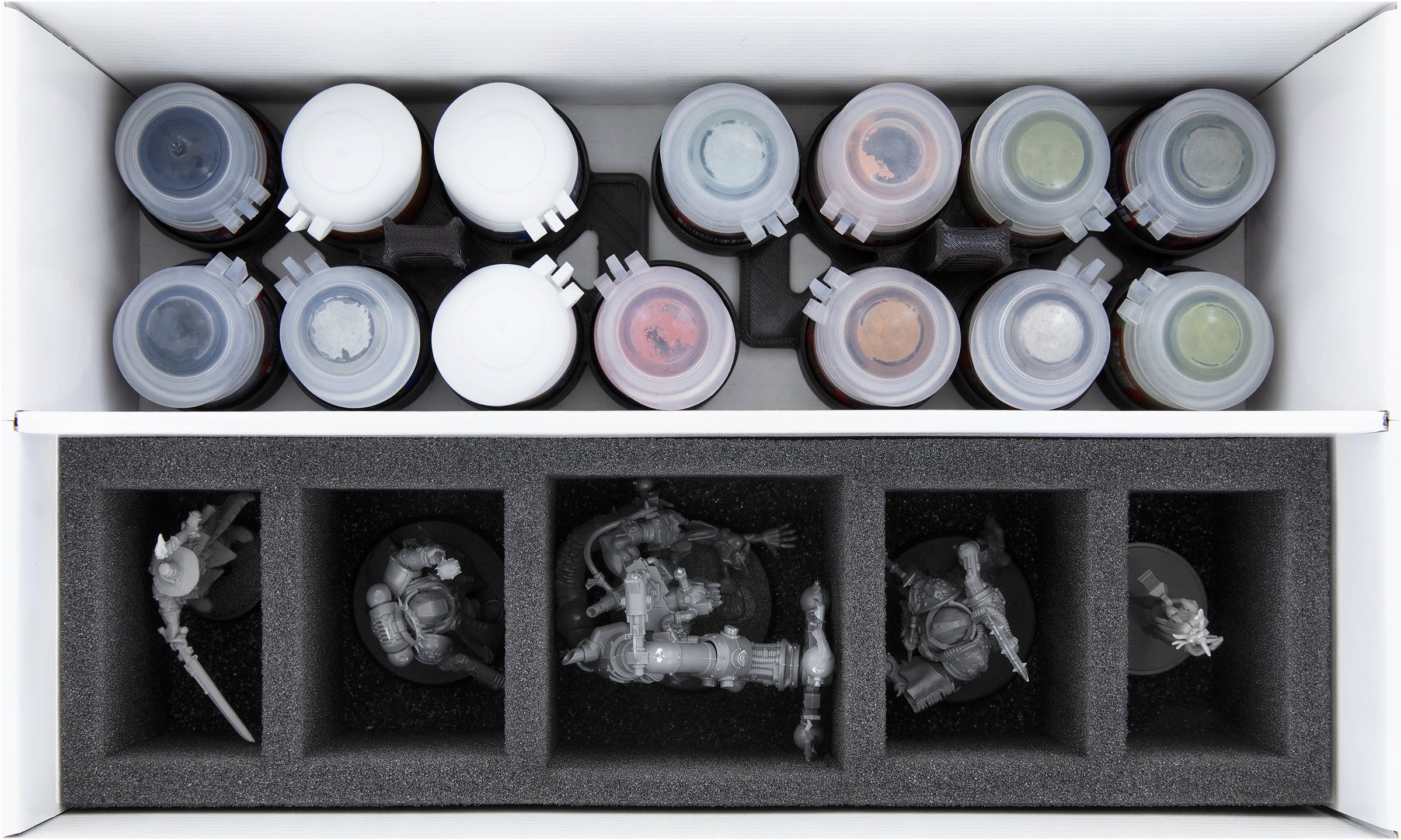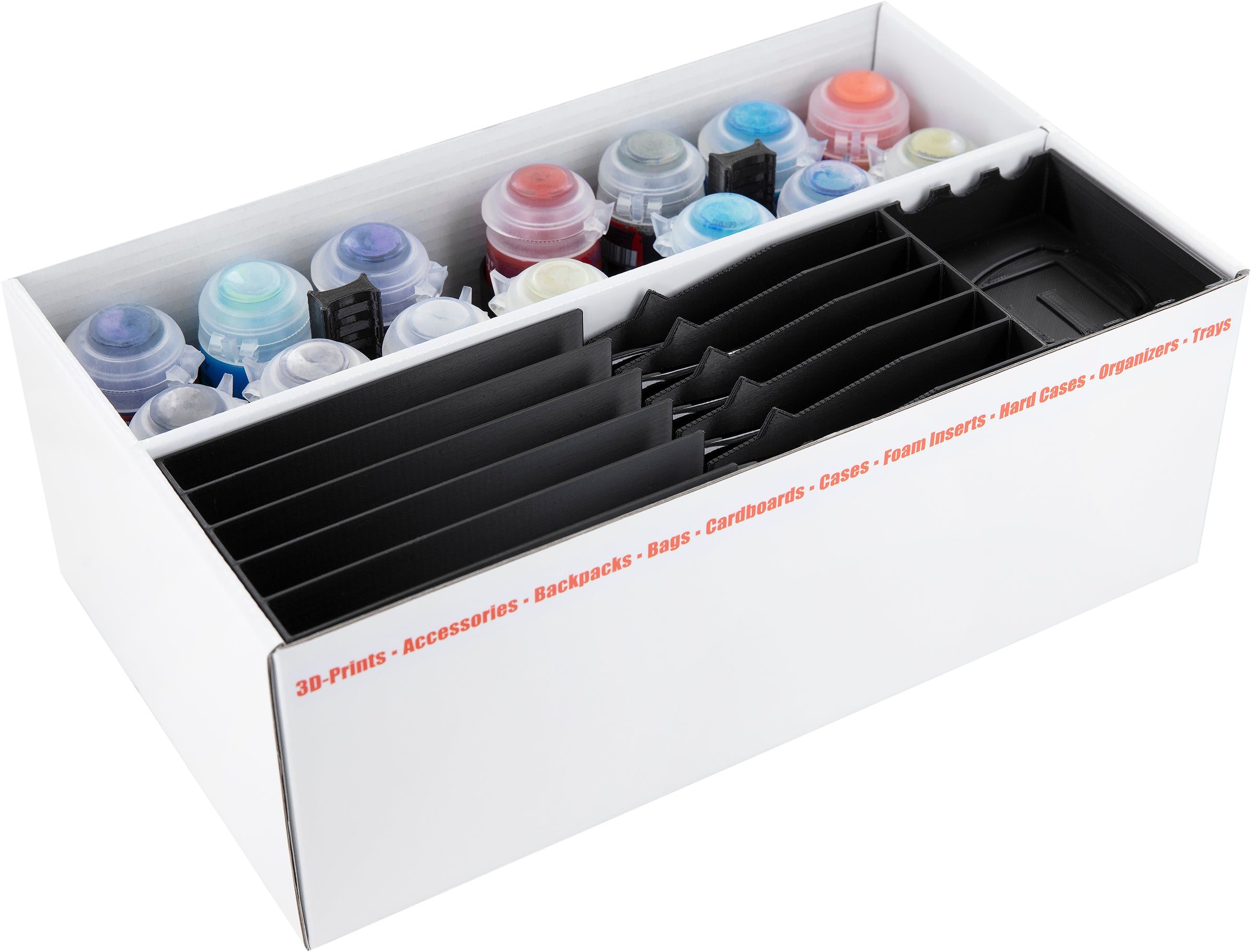 - Up to twenty-eight 12 ml Citadel paint pots can be neatly stowed away in the Feldherr paint pot holders.