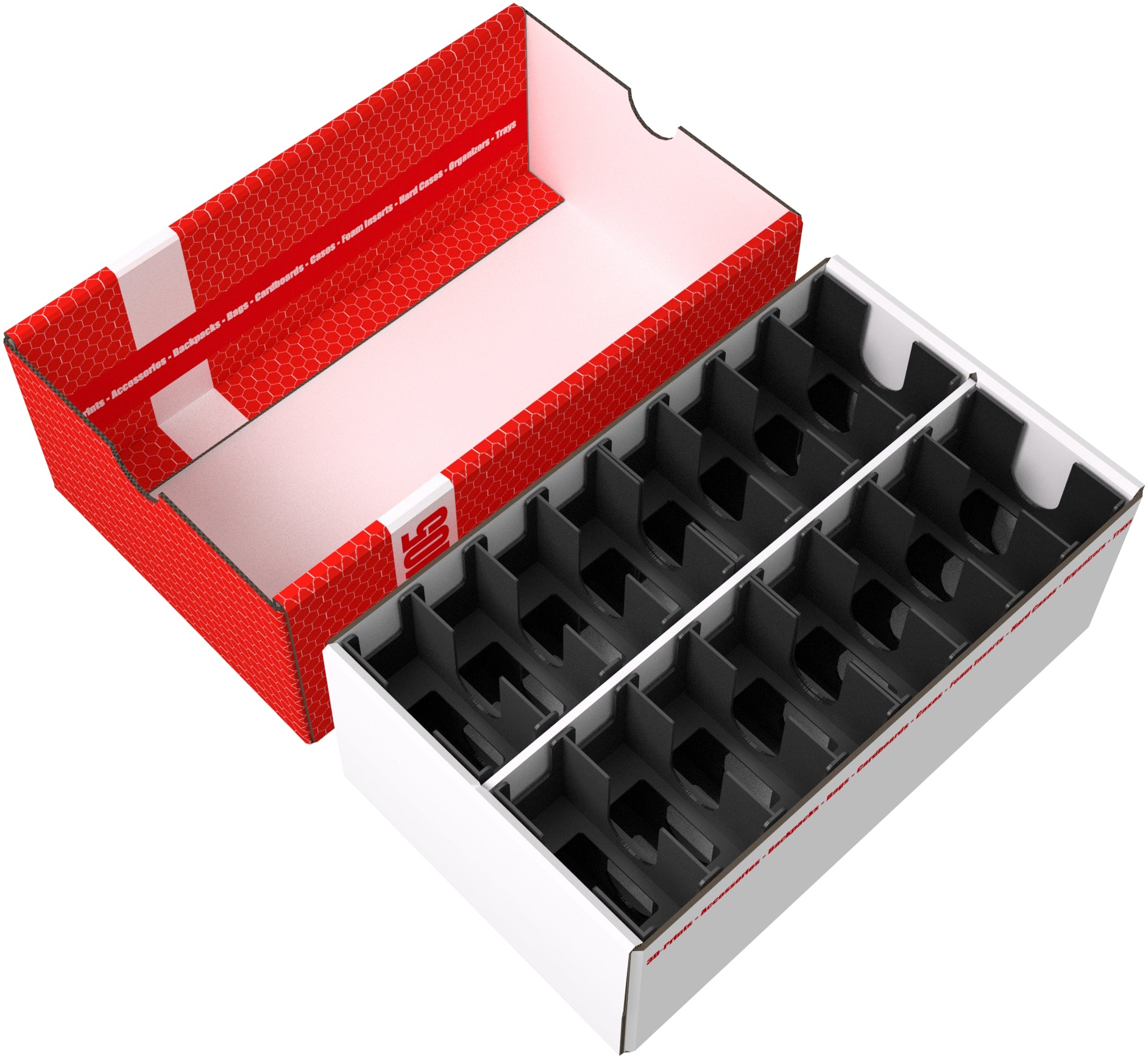 The Storage Box consists of two parts, a box, and a lid. Both parts are made of coated cardboard. A divider in the middle of the box divides it into two equally sized compartments. The slip lid protects the cards from dust and other external influences.