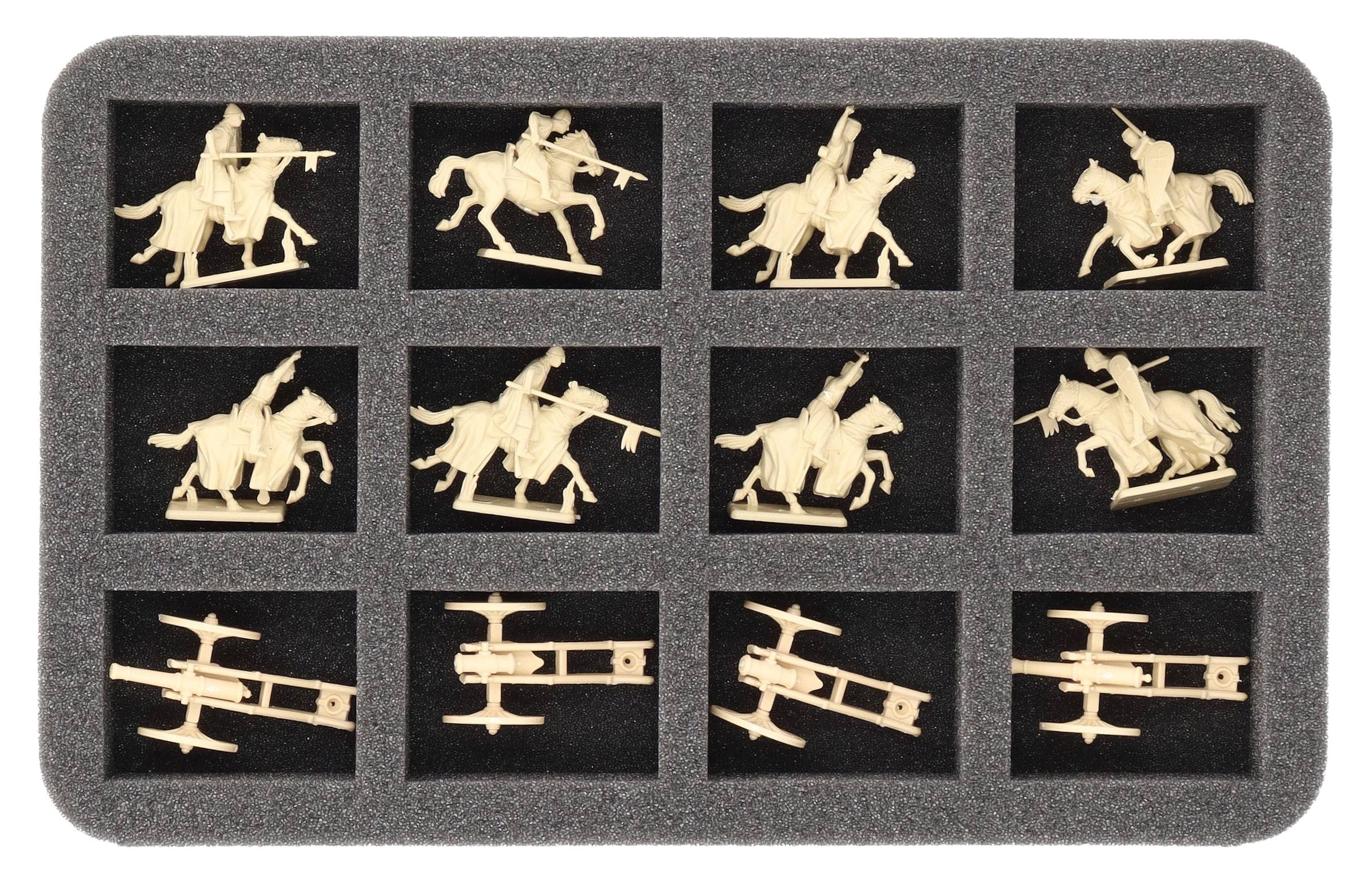 - 1 Half-Size foam trays with 12 compartments for bulky 20 mm tabletop miniatures like the Templar Knights, cannons from the French Imperial Guard Artillery and miniatures with similar dimensions (HS035A070)