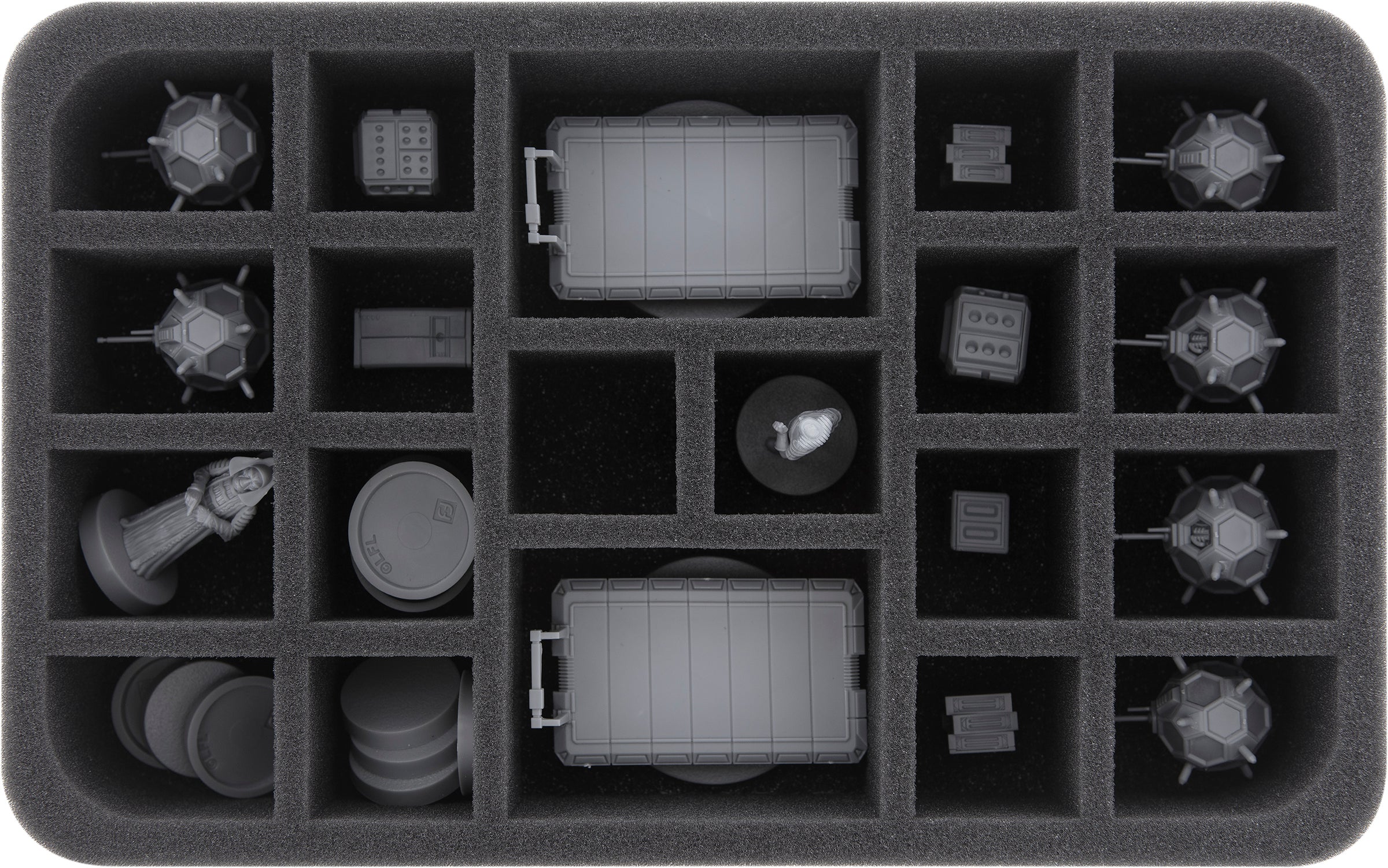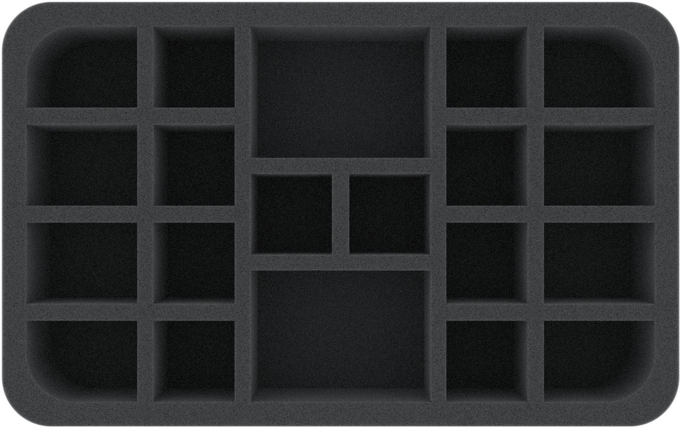 With the included Half-Size foam tray you can keep all 16 miniatures from the Star Wars: Legion Battlefield Expansion "Vital Assets" safe and tidy. All miniatures can be stored with or without base. In the perfectly fitting compartments, the sensitive parts of the plastic figures are just as well protected against bending as the colours of ready painted models against scratches and other annoying damage.