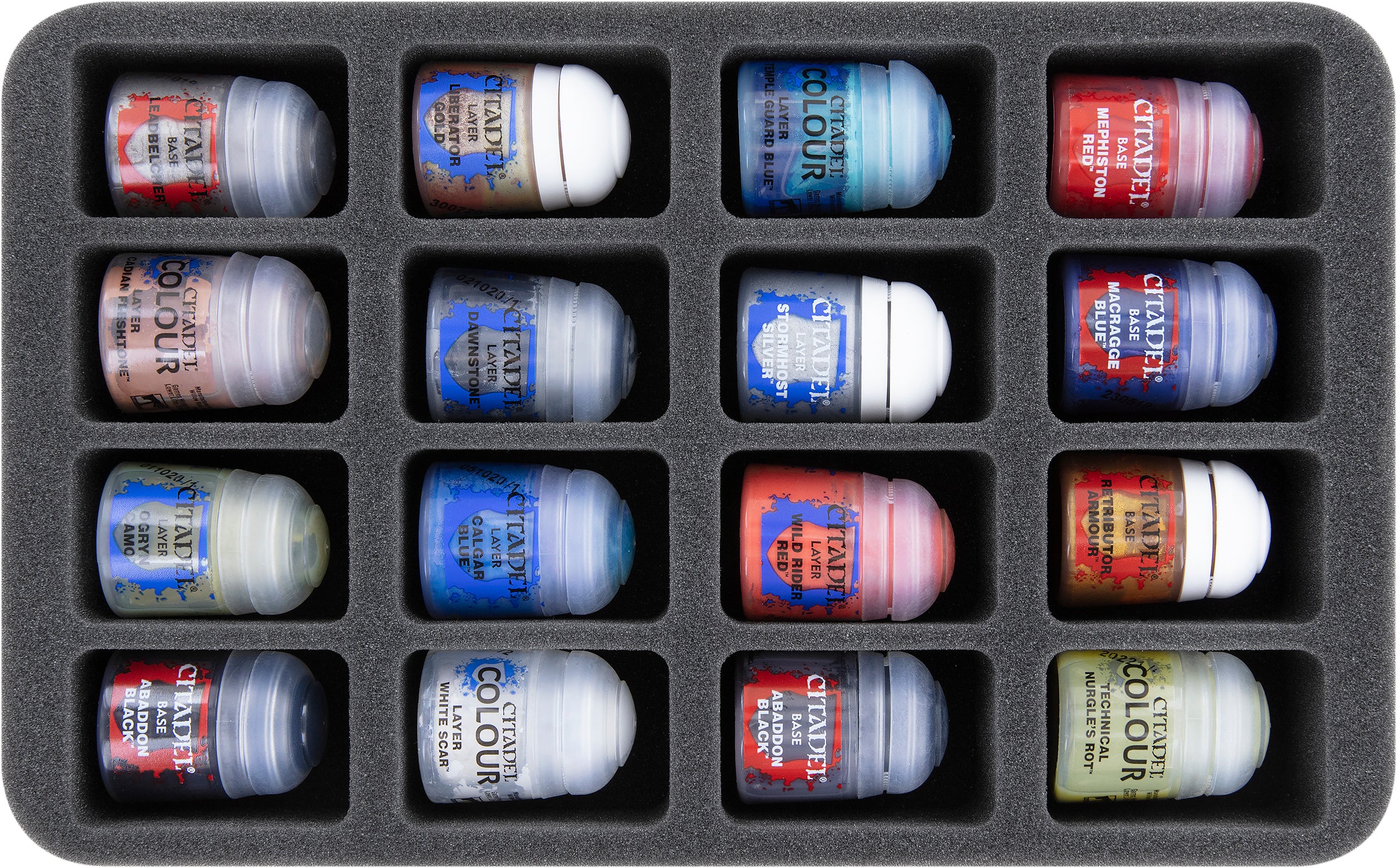 Up to 16 Citadel paint pots in 12 ml, 18 ml, and 24 ml size can be stored clearly in the Half-Size foam tray. Models on 25 mm or 32 mm bases will fit, too.