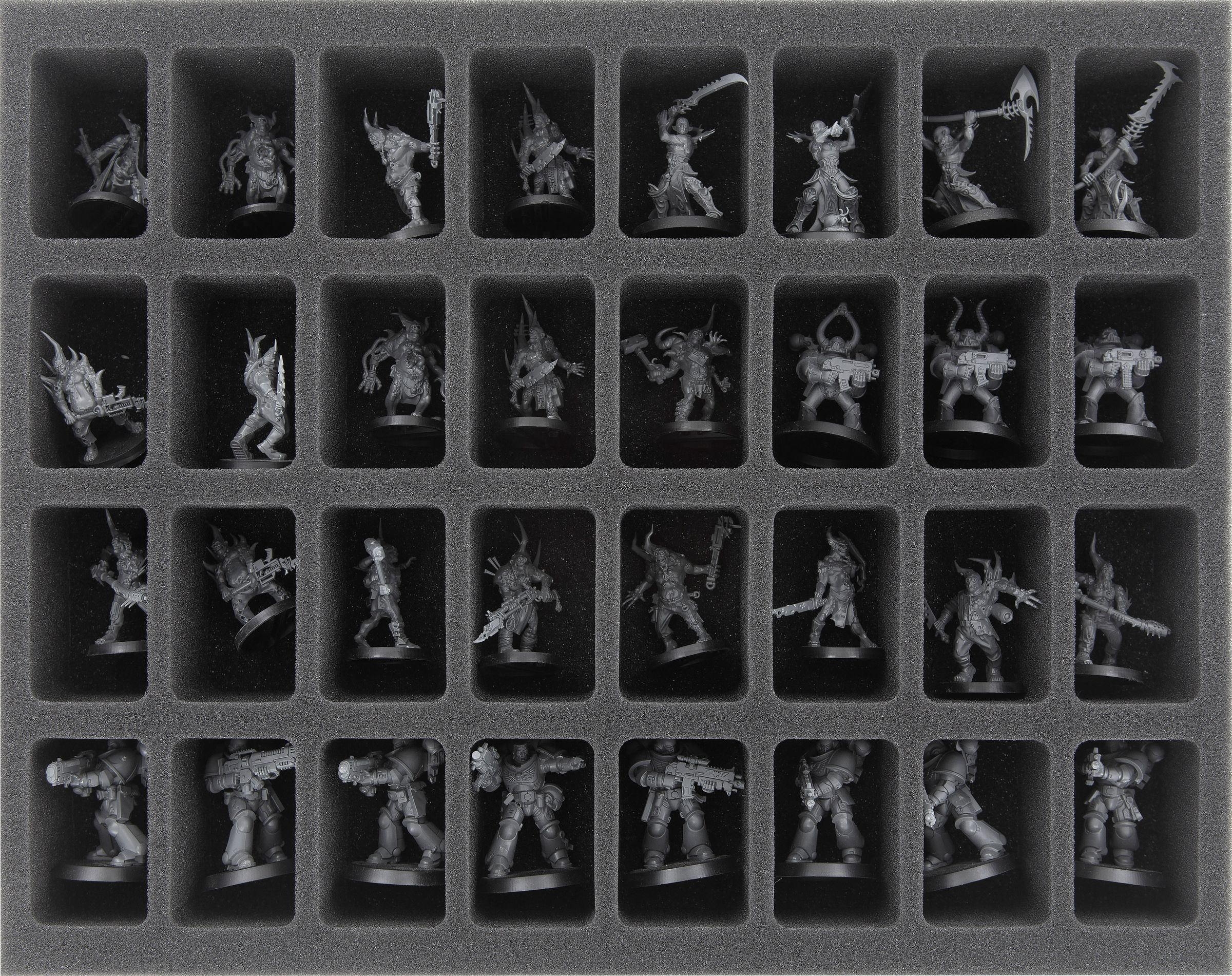 Two foam inserts offer space for up to 64 classic warrior and monster miniatures on round or square bases up to 35 mm.