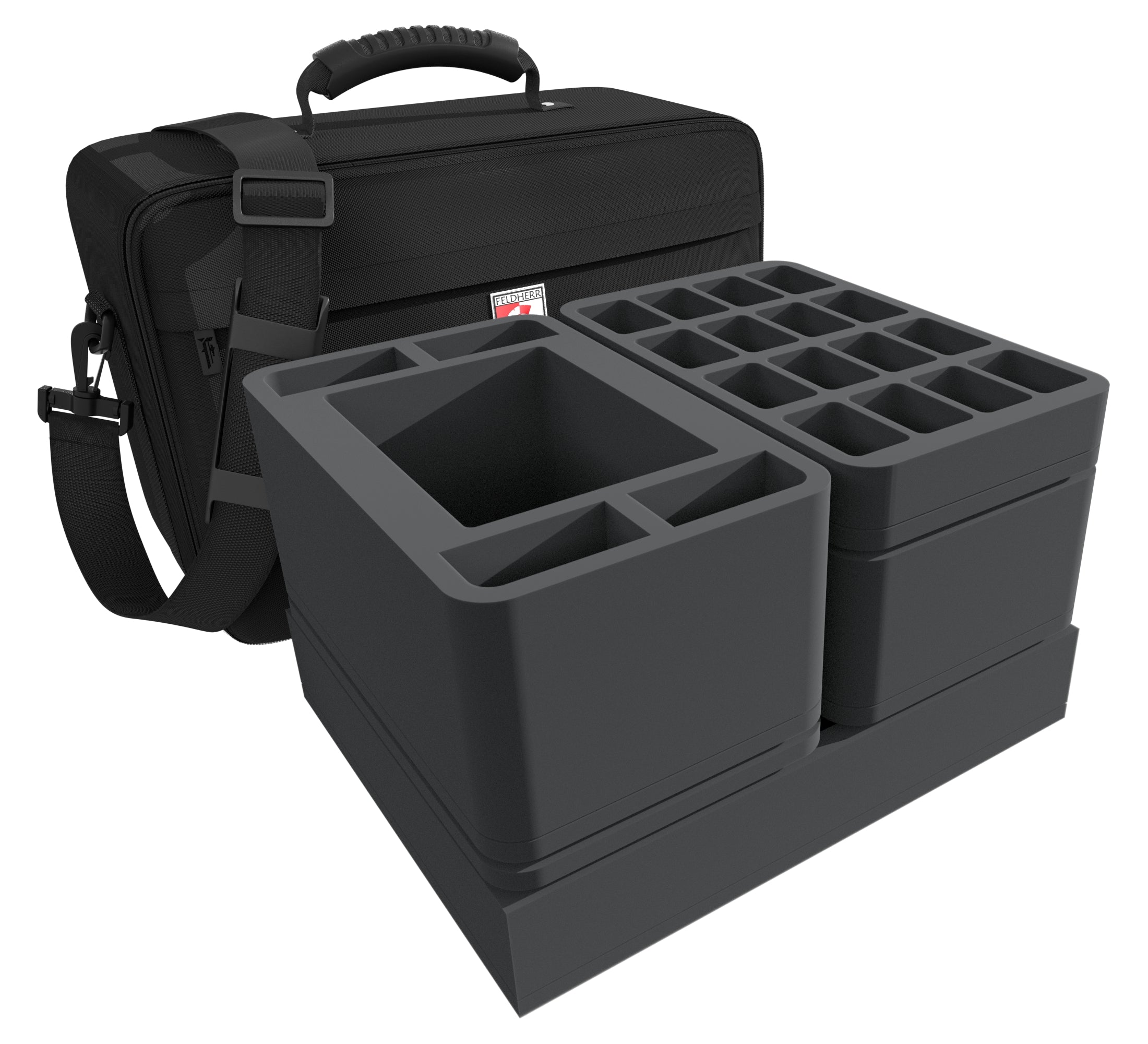 The inserts fit exactly into the robust MAXI bag. This consists of particularly hard-wearing material. In addition, padded side panels and a reinforced base ensure that your miniatures are well protected from external influences even when transported by car or train. In addition to the large main compartment, the bag has a small zippered compartment on the front. There is a rubberized, handy carrying handle on the top. If you prefer to have your hands free, the bag can also be used comfortably as a shoulder bag thanks to the wear-resistant, detachable shoulder strap.