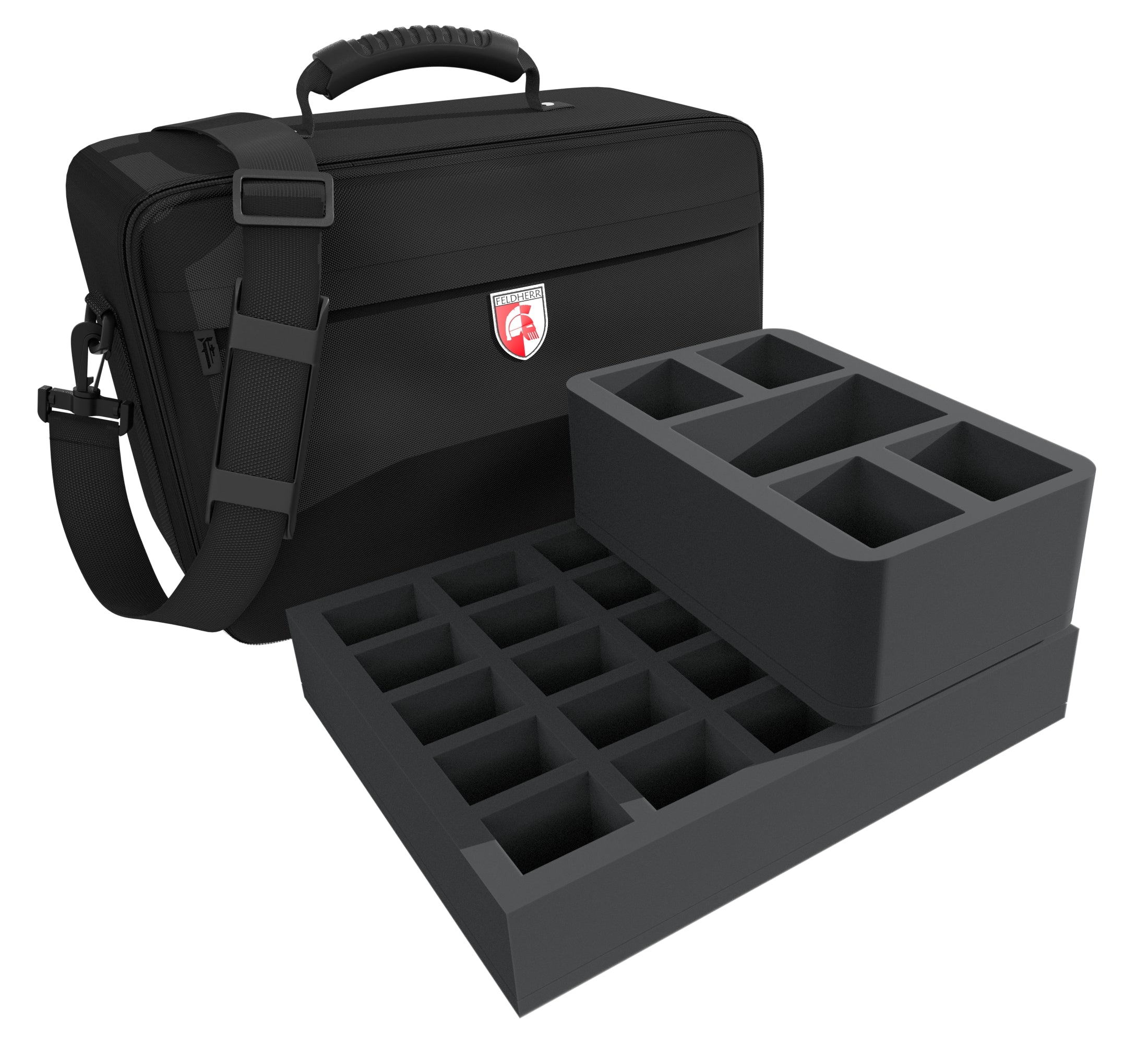 The Leagues of Votann Vannot rise from the galactic core and conquer the surrounding worlds, confiscating resources and destroying anyone who threatens their strongholds. There is this convenient MAXI bag so that your miniatures are not harmed when you transported them to the next game night. The bag is filled with matching Feldherr foam trays and offers space for 51 miniatures from your army.