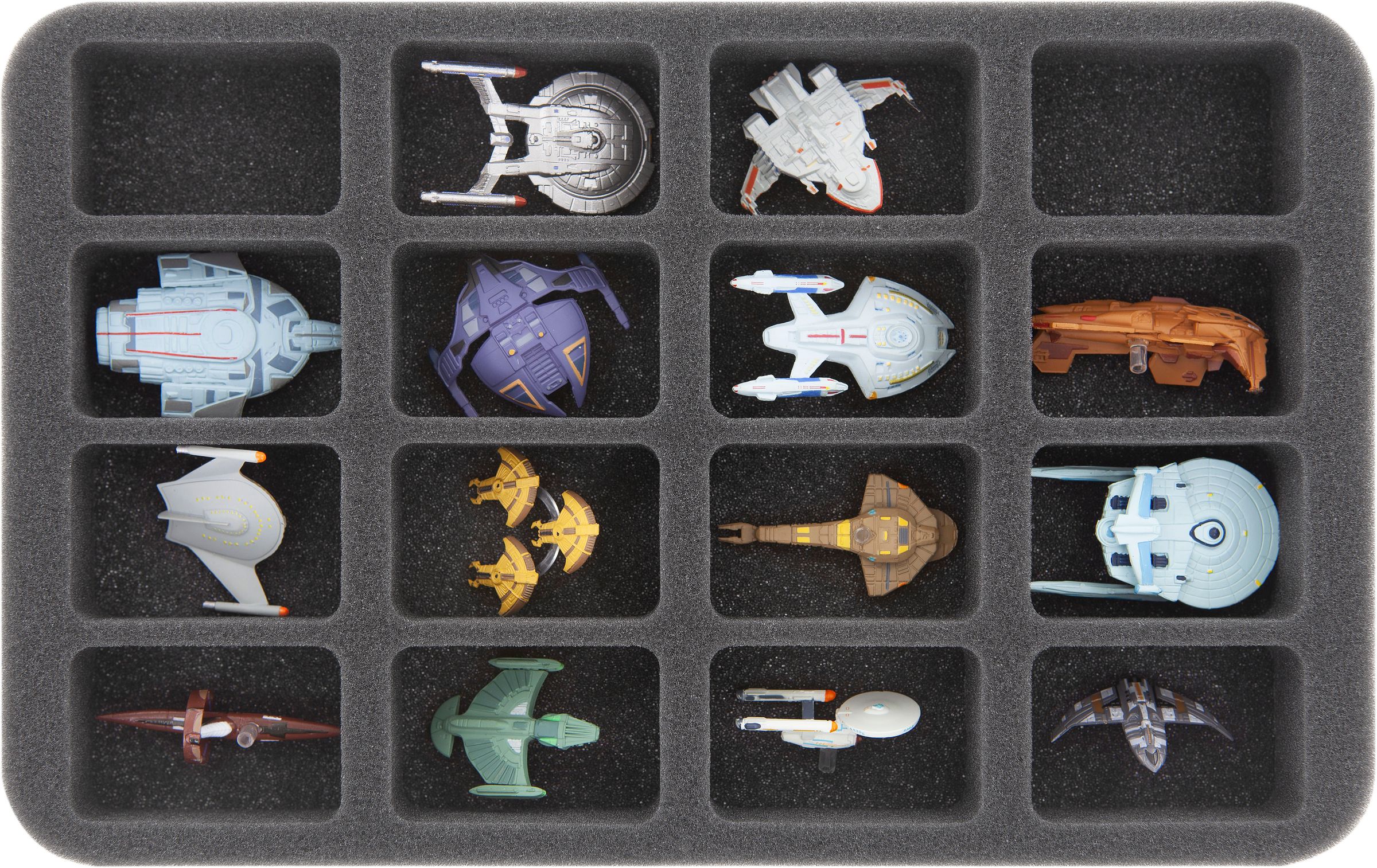 The foam tray with the 30 compartments allows you to store 24 models including the bases. 16 compartments are available for very small ships like e. g. Gal Gath’Thong, U.S.S. Enterprise or Ni’Var. Further 8 compartments provide space for slightly longer models like D’Kyr or U.S.S. Enterprise E. In addition, the tray features 6 compartments which allow you to store the 24 bases for the 24 ships.