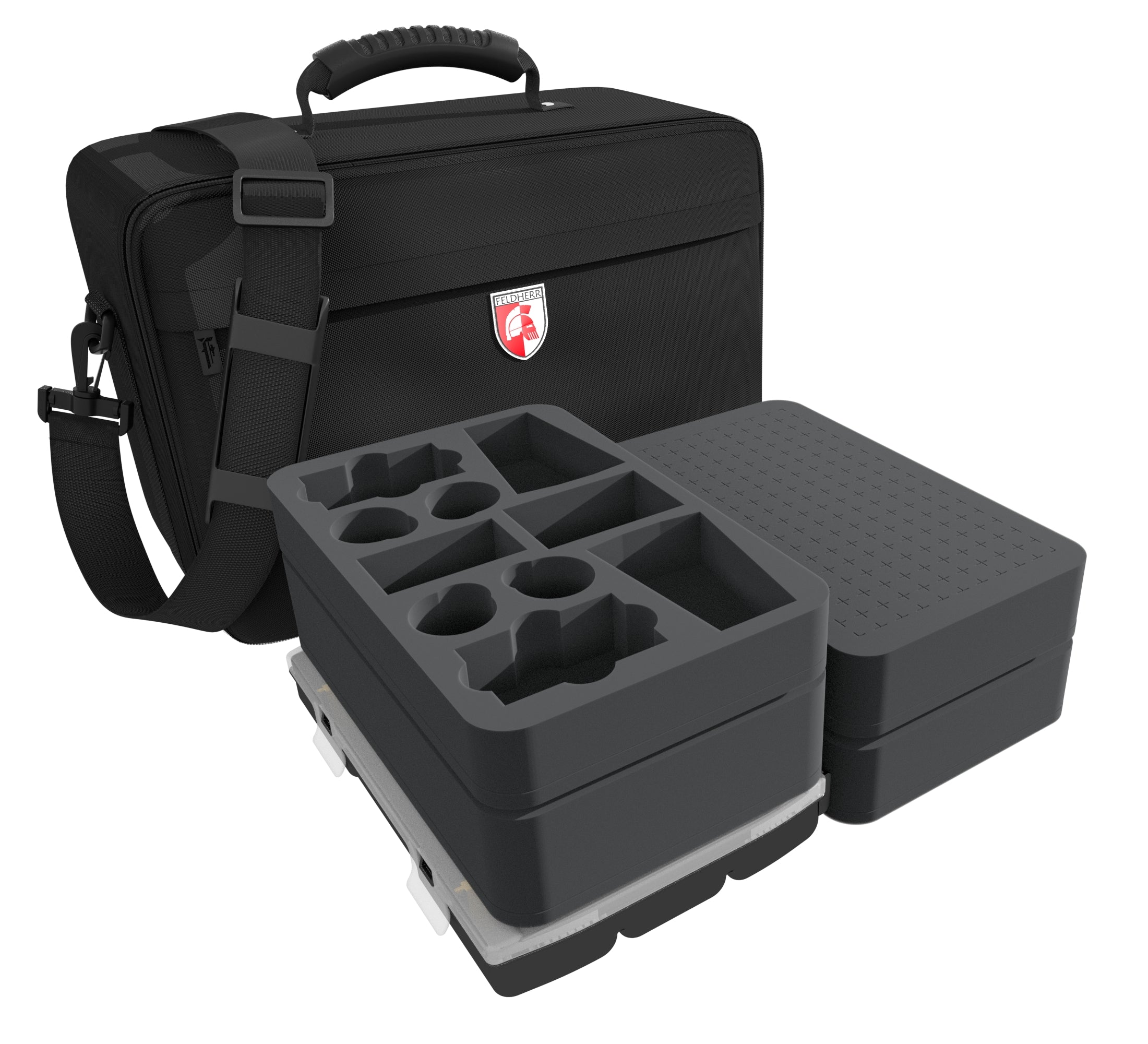 Feldherr Maxi Bag for Star Wars Armada. The Bag comes with 6 Star Wars Armada foam trays and one plastic Feldherr box for token, dice and all the other small stuff. Also included is a pick and pluck pre-cubed 40 mm foam tray for individual shapes. The Maxi Bag is complete filled with foam and stores: