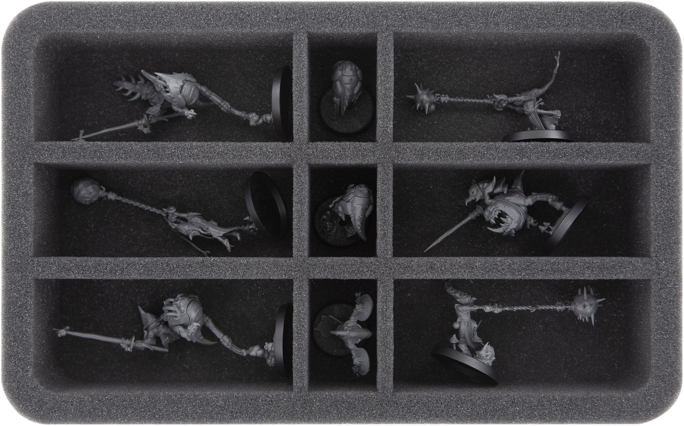 - 2 Half-Size foam trays, each with 9 compartments for e.g. Squig Hoppers, Boingrot Bounderz (HS050WH55)