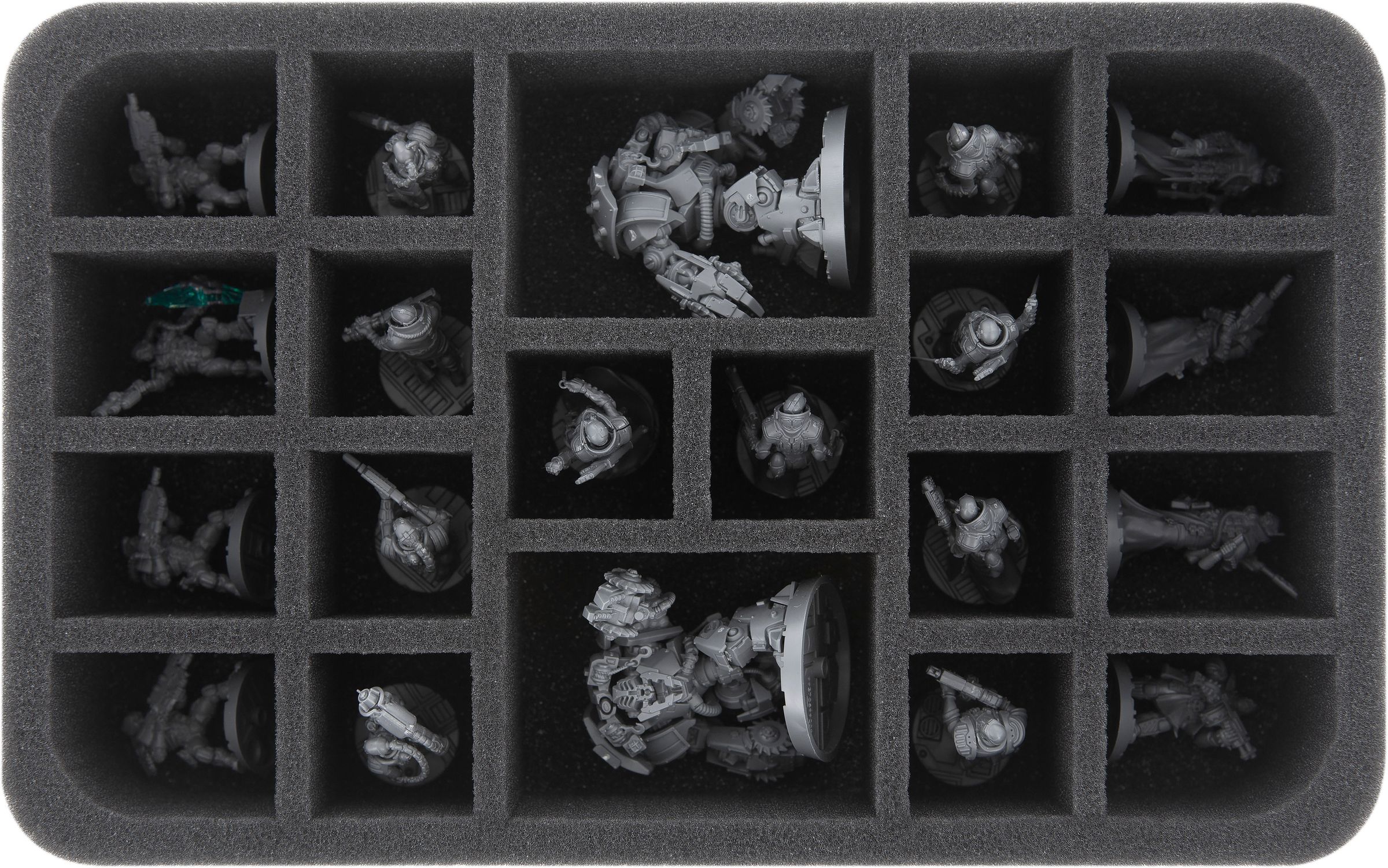 To make sure your (sometimes quite sensitive) gangers don’t get hurt on the way to game night, Feldherr presents you this Medium Plus bag with matching foam for Necromunda. A total of 5 trays offer space for 77 miniatures. The fine-pored foam reliably protects your models – fragile parts stay intact during storage and transport, sensitive parts remain free from scratches and abrasion.