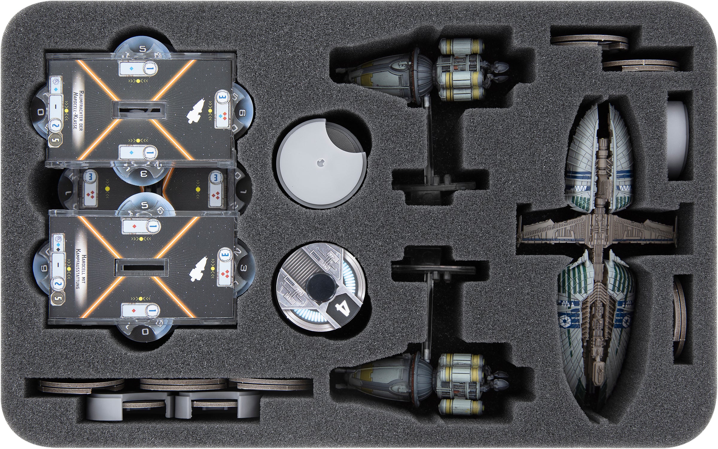 - 1 Half-Size foam tray for 2 Hardcell-class Transports + 1 Munificent-class Frigate incl. accessories (HSMFAU050BO)