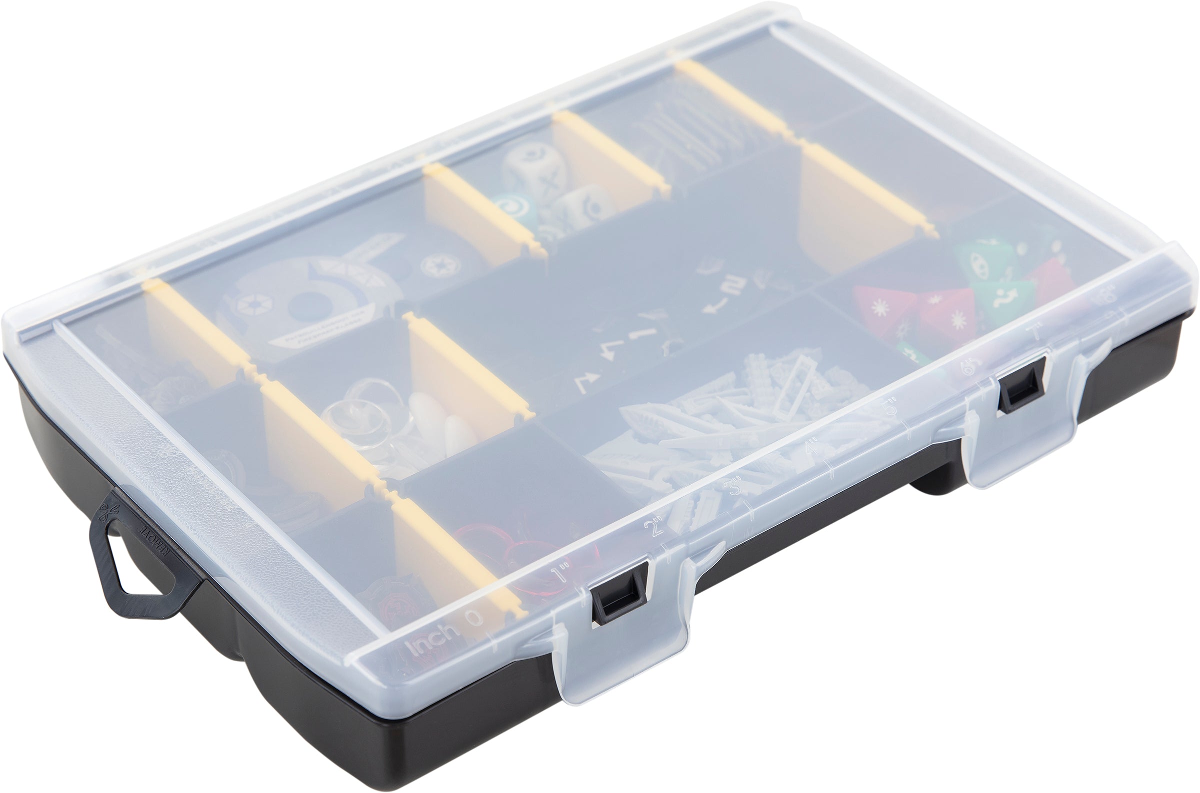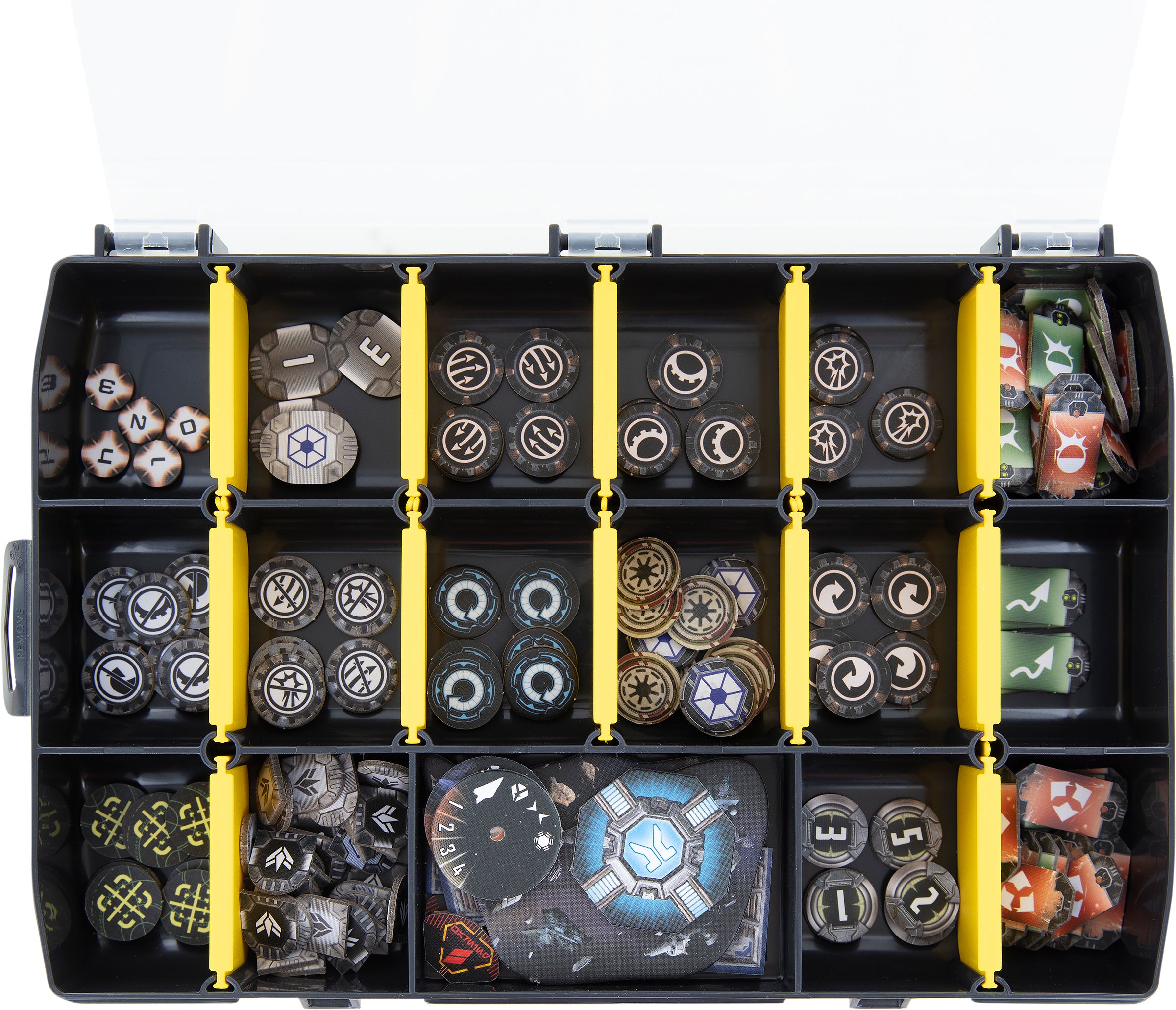 The box has 5 oblong compartments. These can be further subdivided using the 12 dividers supplied. You can divide up to 17 compartments for storing your game materials.