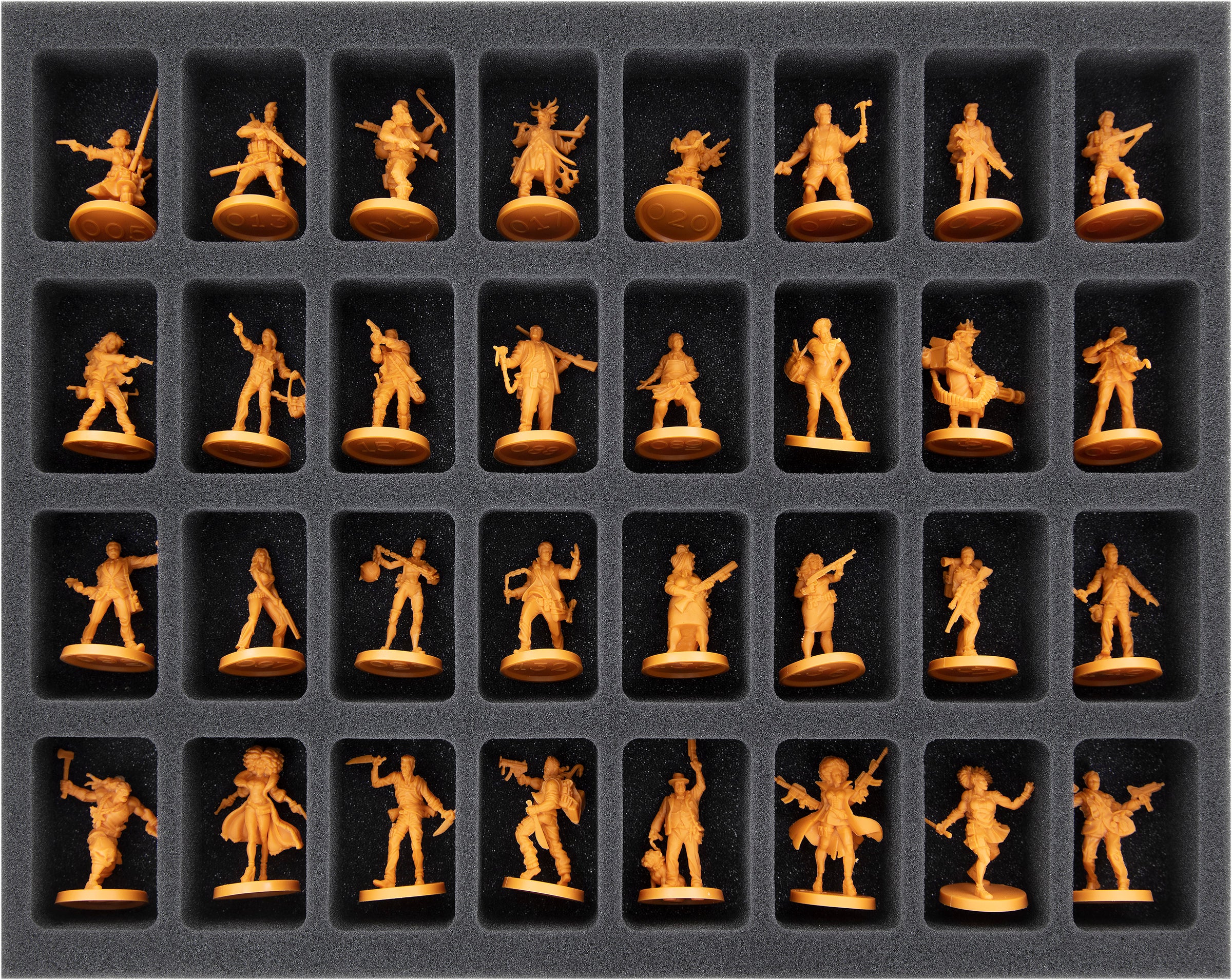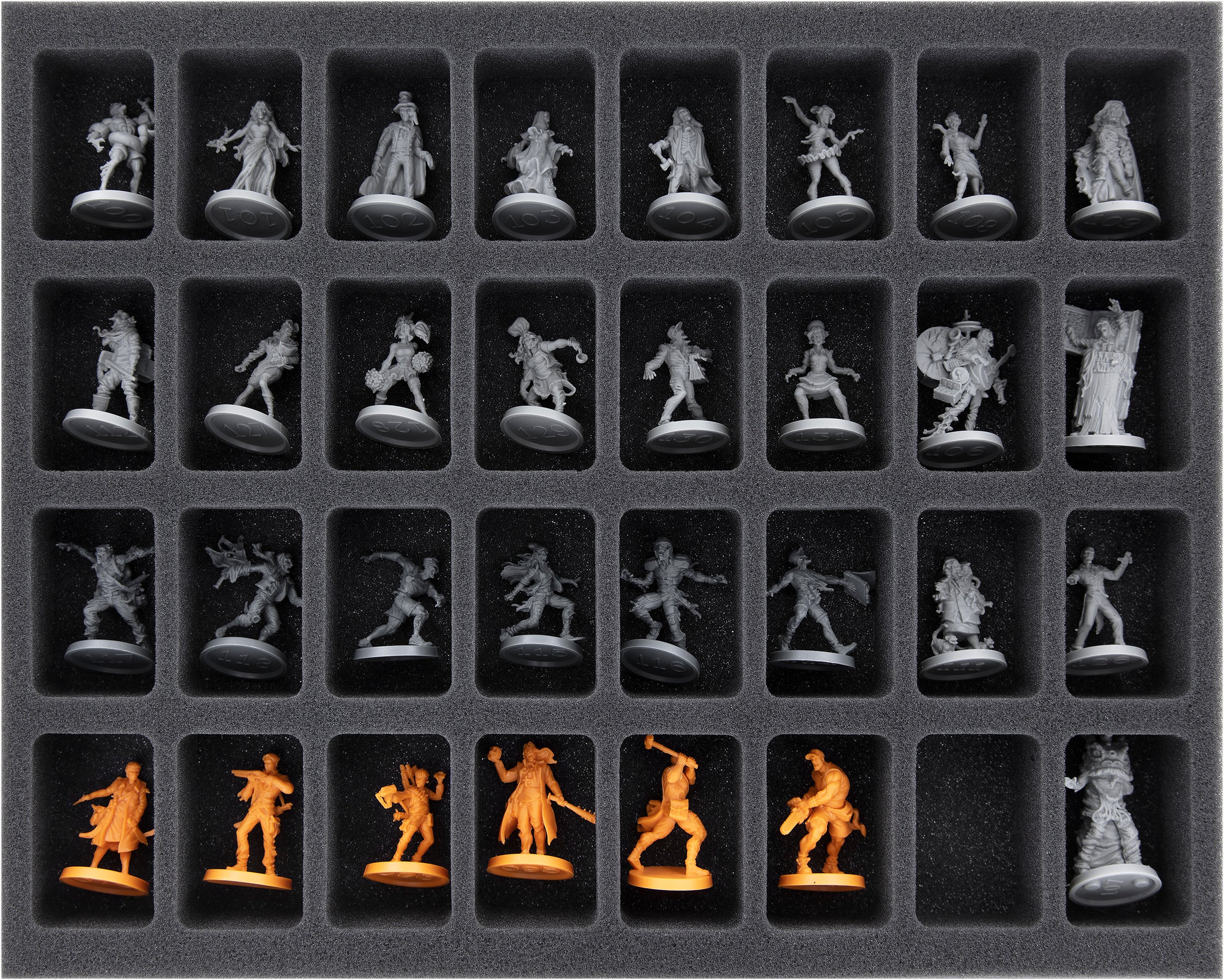 - 2 Full-Size foam trays with 32 compartments each for Zombie and Survivor miniatures (FSMEDS040BO)