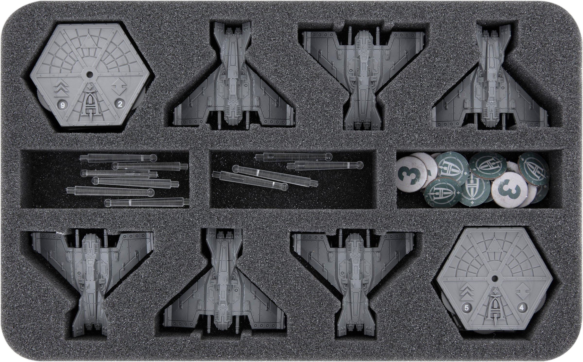 Six Half-Size trays ensure that all the miniatures in your Imperial Navy are reliably protected. Miniature-precisely cut compartments for each model prevent them from sliding around or bumping into each other during transport and also keep the colors of your painted miniatures free from abrasion and scratches.