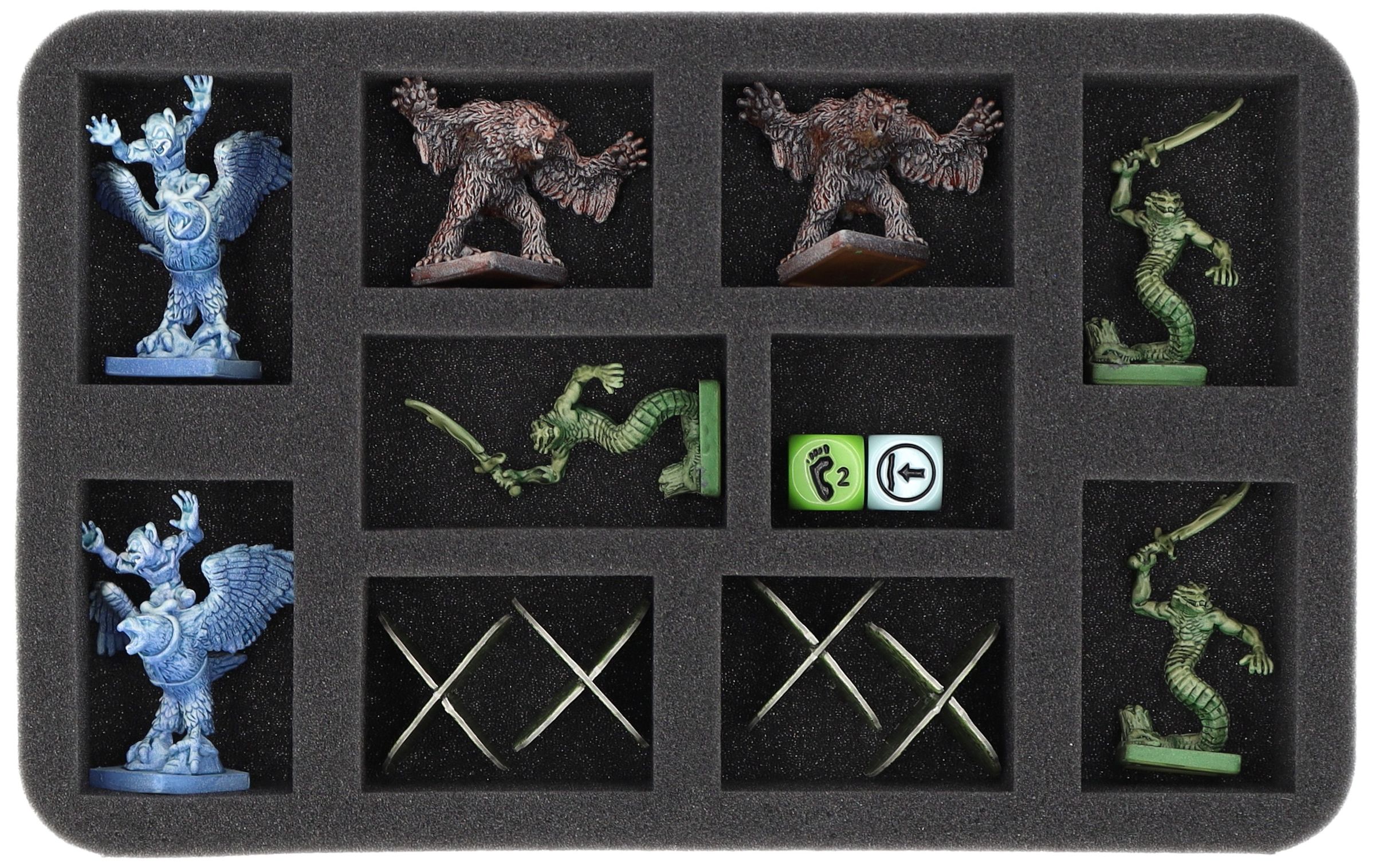 • 1 Half-Size foam tray with 10 compartments for miniatures like monsters, heroes, and tokens, as well as dice (HSLM050BO)