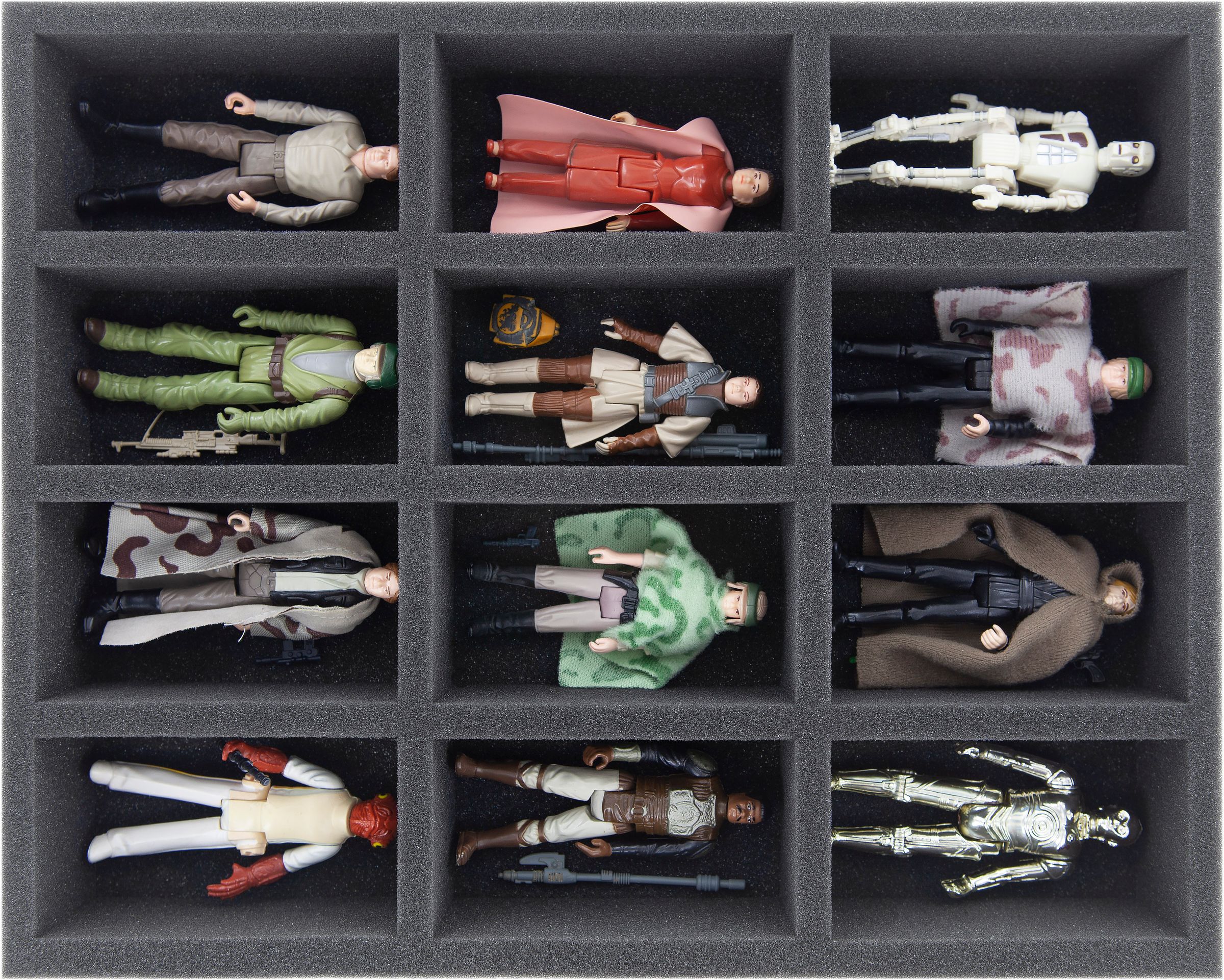 The two foam trays have 12 same-sized compartments each. The trays are ideal for the safe storage of medium-sized miniatures (3.75 inch) like e. g. Imperial Stormtroopers or Luke Skywalker. The fine-pored foam provides ultimate protection against damage – fragile parts stay intact, surfaces don't get scratched.