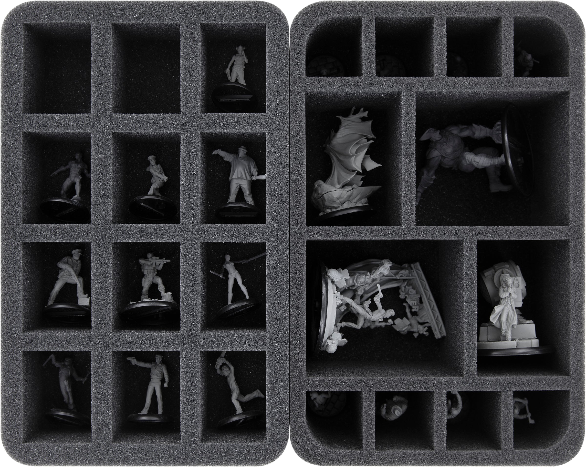 Thanks to the custom-fit cut, the miniatures sit tight in their compartments. Even when being transported through Arkham Asylum, the miniatures do not slip and remain in place. The soft, fine-pored foam protects intricate details from breaking off and the colors of your colored models from scratches and paint abrasion.