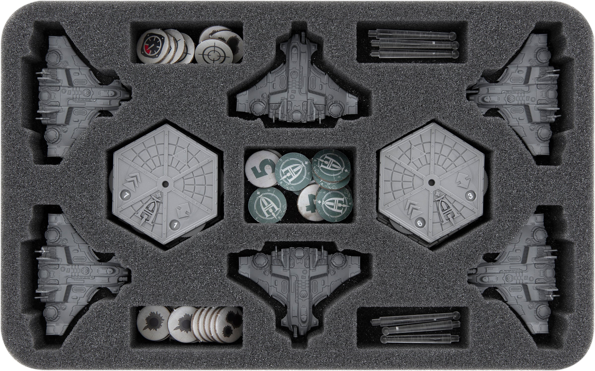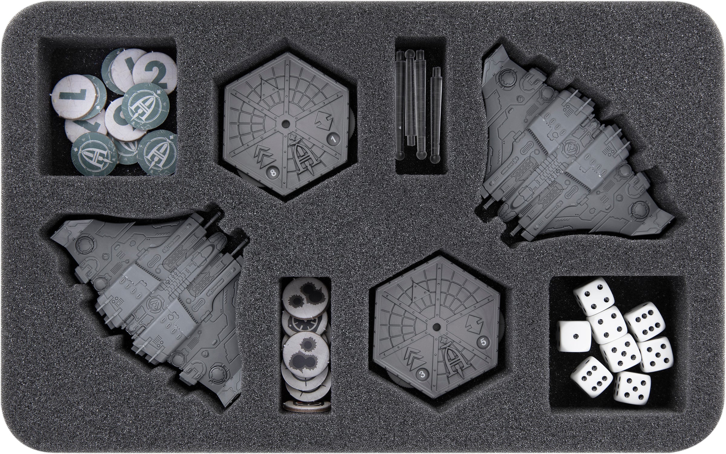 For the bigger Tiger Shark Bombers, the two inserts, each with eight compartments, provide a protective hangar. Eight custom-cut compartments serve as a safe storage place for your models and bases. Whether you equip the miniatures with heavy bundle cannons or heavy plasma accelerators, they will fit into the trays with both equipment options. You can use the remaining eight compartments for small parts, tokens, or dice.