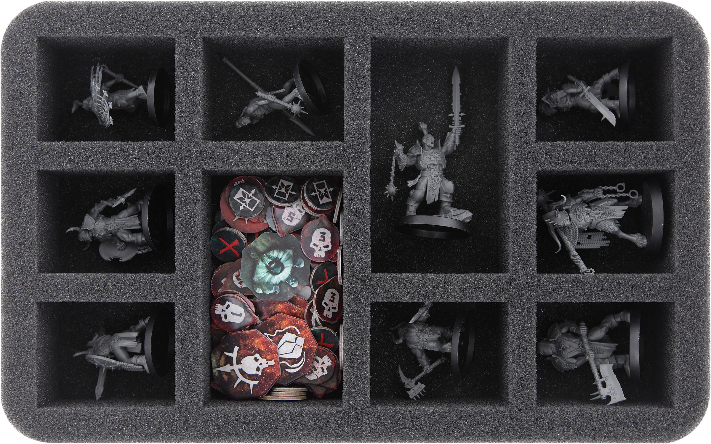 - 1 Half-Size foam tray with ten compartments for standard infantry like Chaos Warriors + protruding models like a Chaos Warrior with banners + WarCry Warbands like Spire Tyrants or miniatures with similar dimensions (HS045A008)