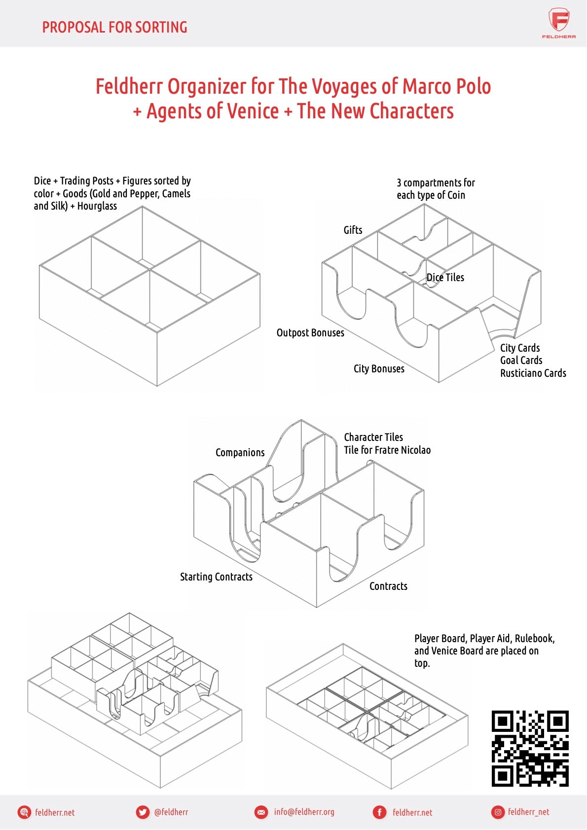 - The Organizer provides space for all game components from the basic game "The Voyages of Marco Polo", as well as the expansions "Agents of Venice" and "The New Characters".