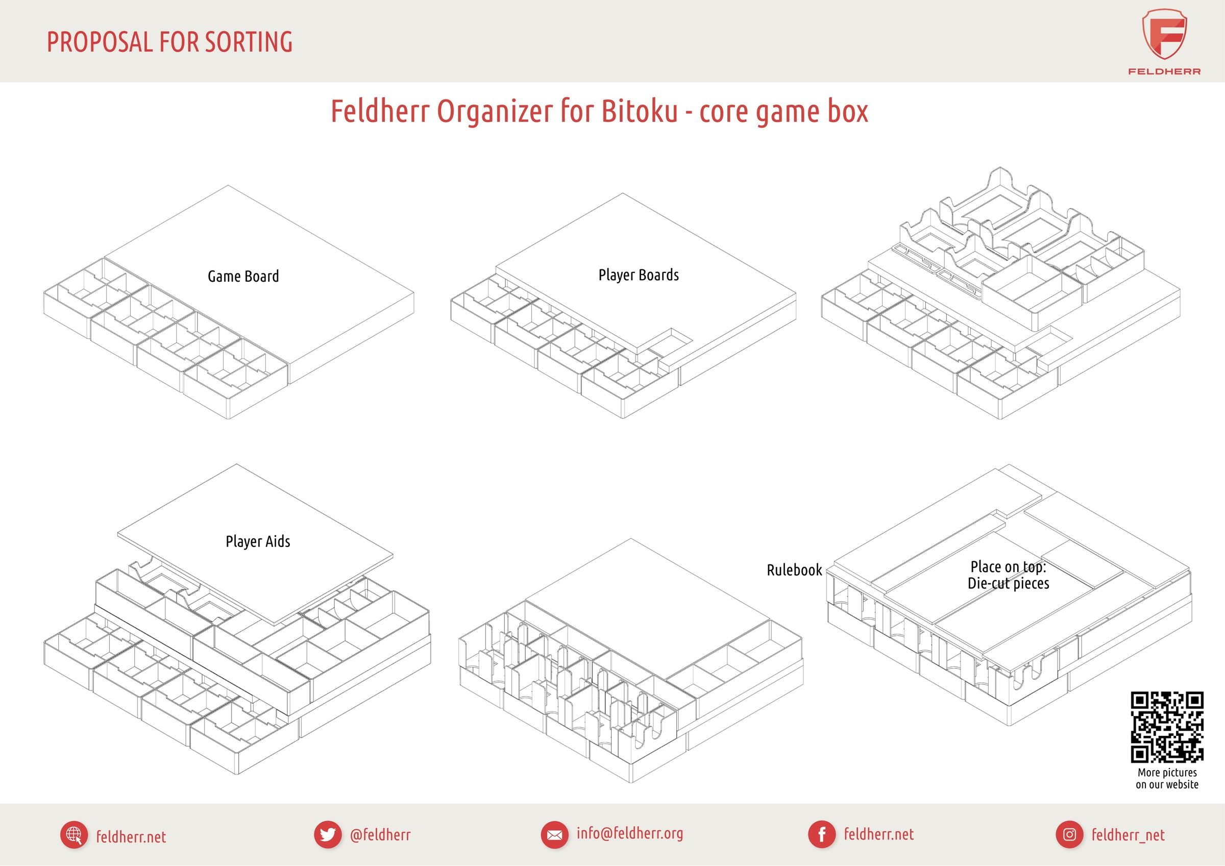 - Store the Game board and player boards/Tengu board in the game box. Rulebooks, player aids, and large die-cut pieces are stored on the Organizer.