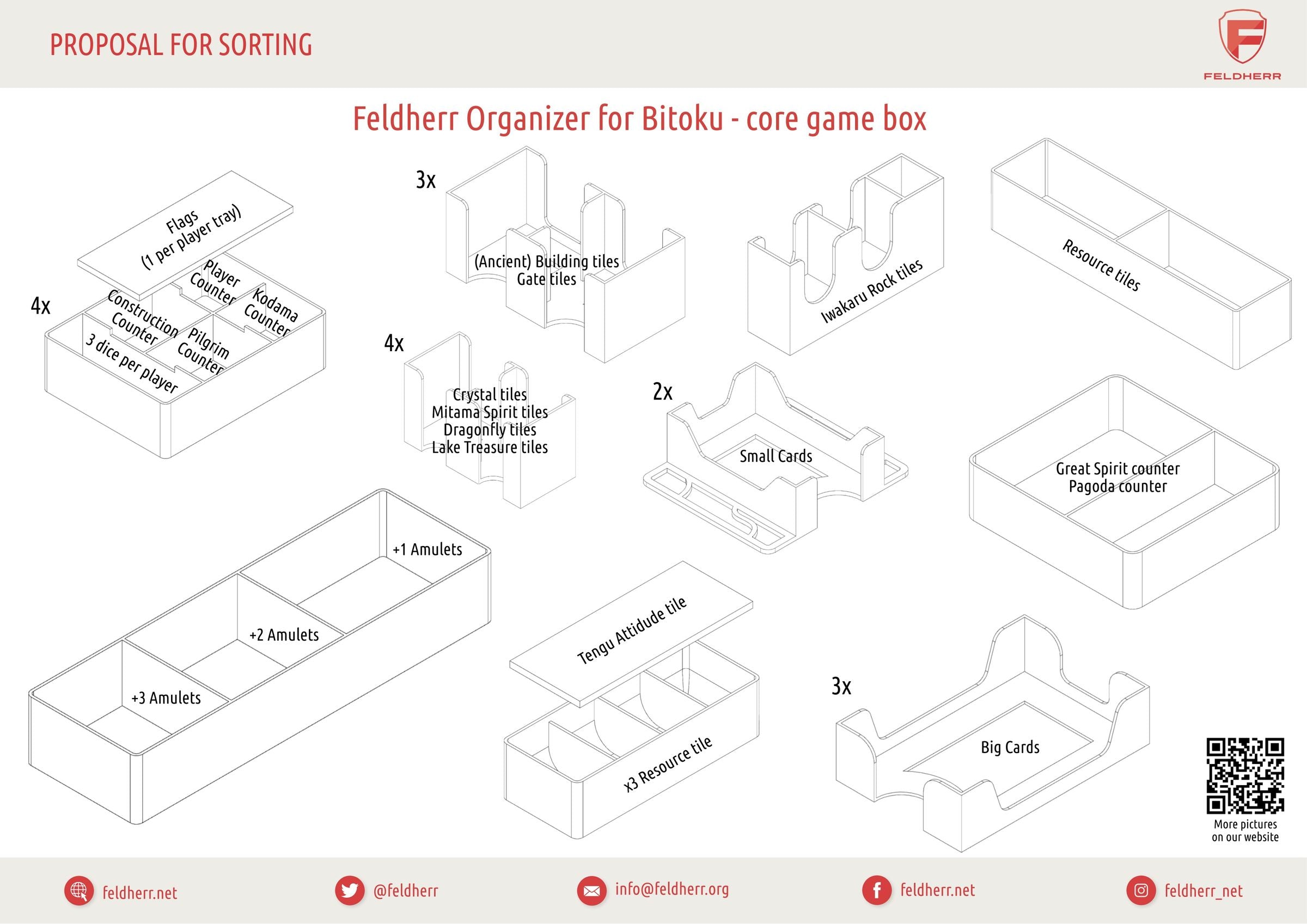 - The inserts ensure order in the box and on the tabletop. Place the card holders with the Bitoku, Yokai, and vision cards and the tile holders with the Building, Crystal, Mitama Spirit, and Dragonfly tiles directly on the Game board.