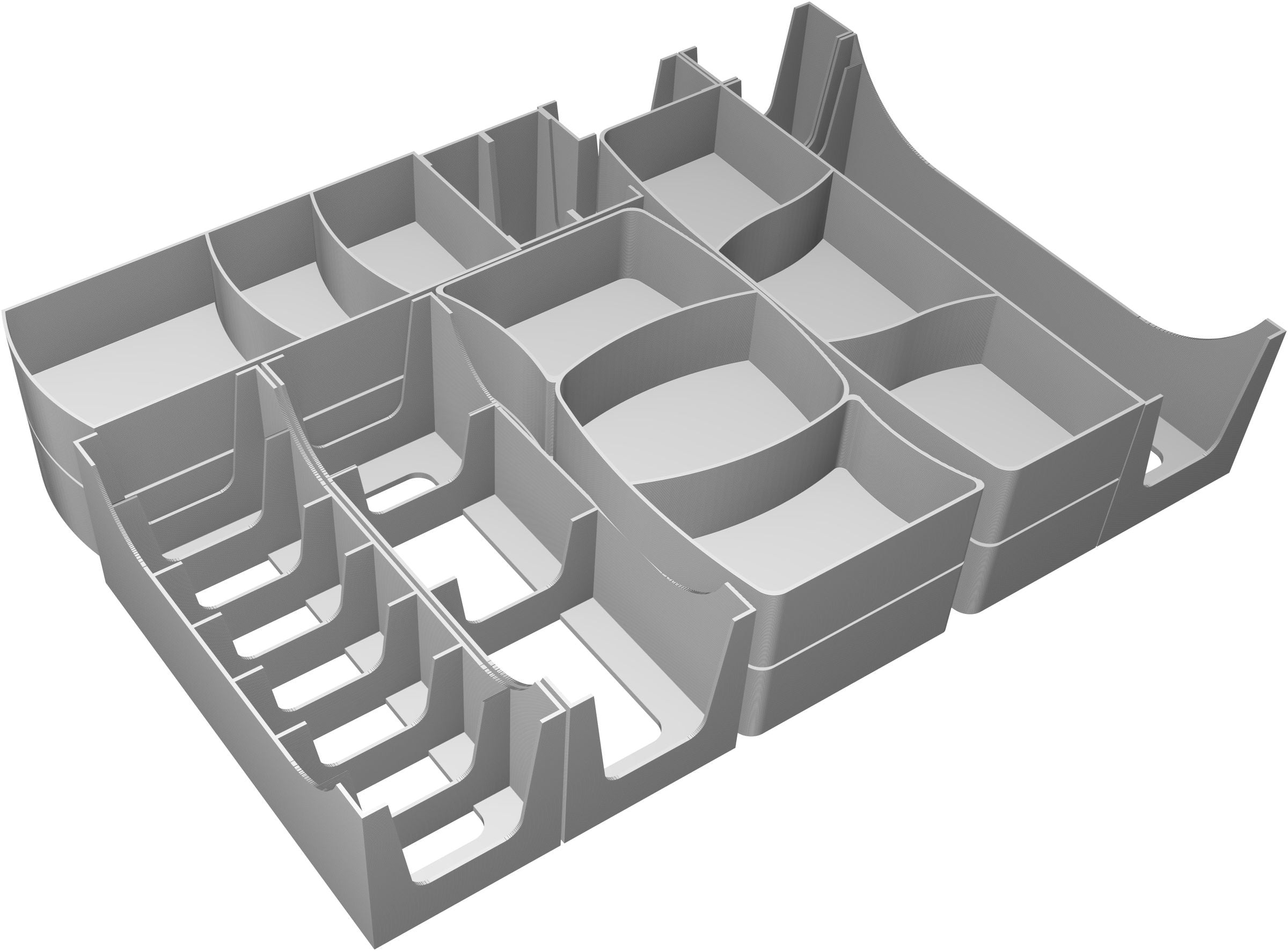 - 10 individually removable boxes made of sturdy plastic offer space for all contents from the core game plus 11 expansions.