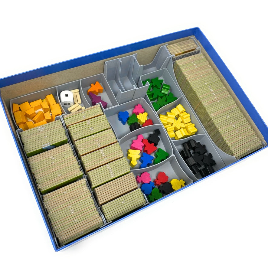 The Organizer creates space and order in your board game box and on the table. Two tile holders and two boxes for the meeple help you sort all the game material from the base game.