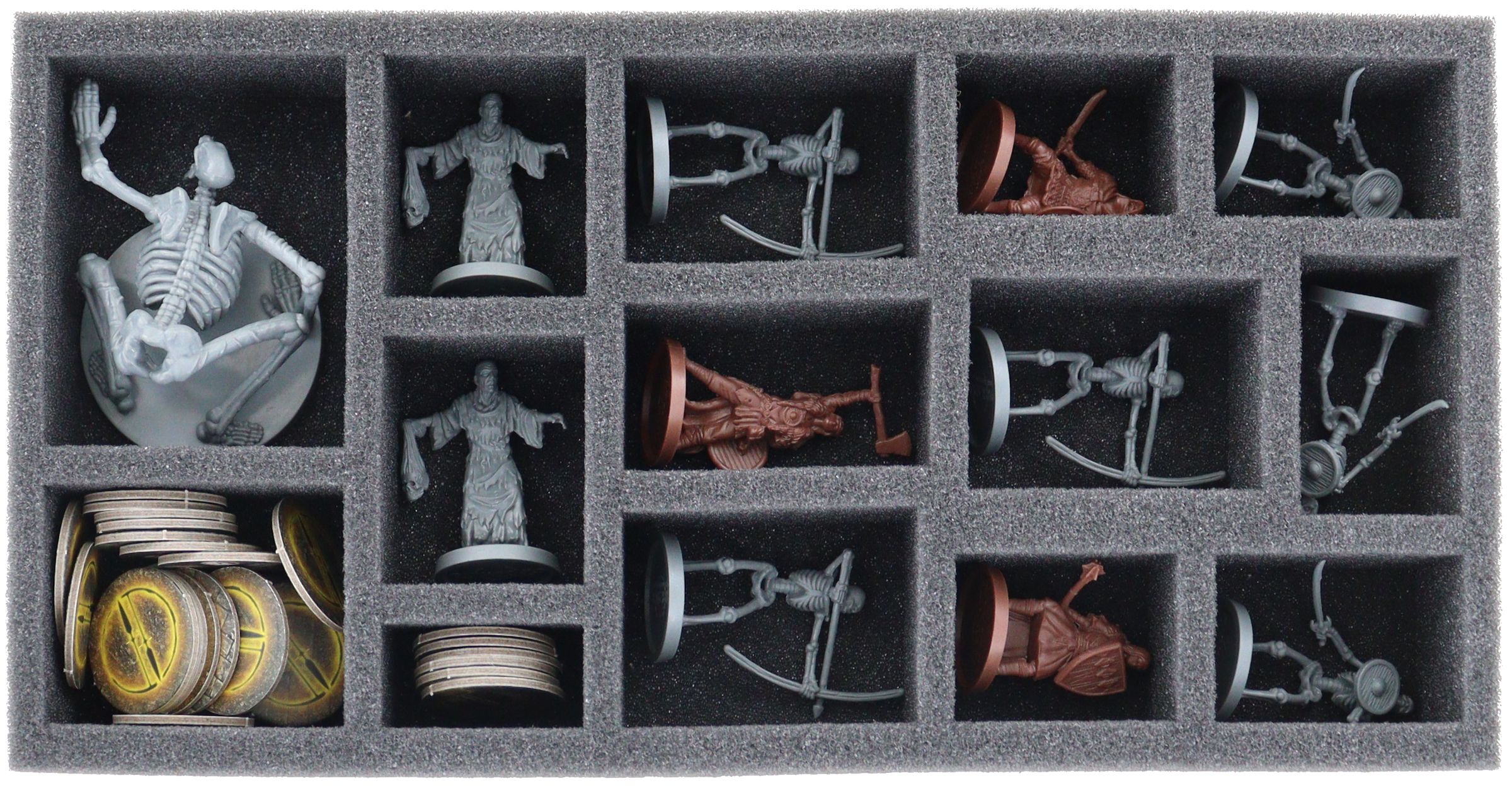 - 1 foam tray with thirteen compartments for Necromancer, Skeleton Archer, Skeleton Beast, and Skeleton Soldier. Cleric, Pyromancer, Thief + Trap Token, Barrel Token