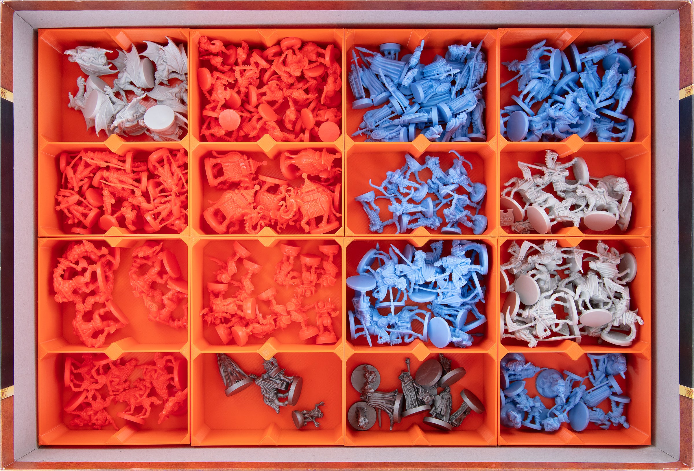 - 8 plastic figure holders with 2 compartments each for all 259 plastic miniatures from the core game and both expansions (the companions, the Dead Men of Dunharrow or the Balrog of Moria).