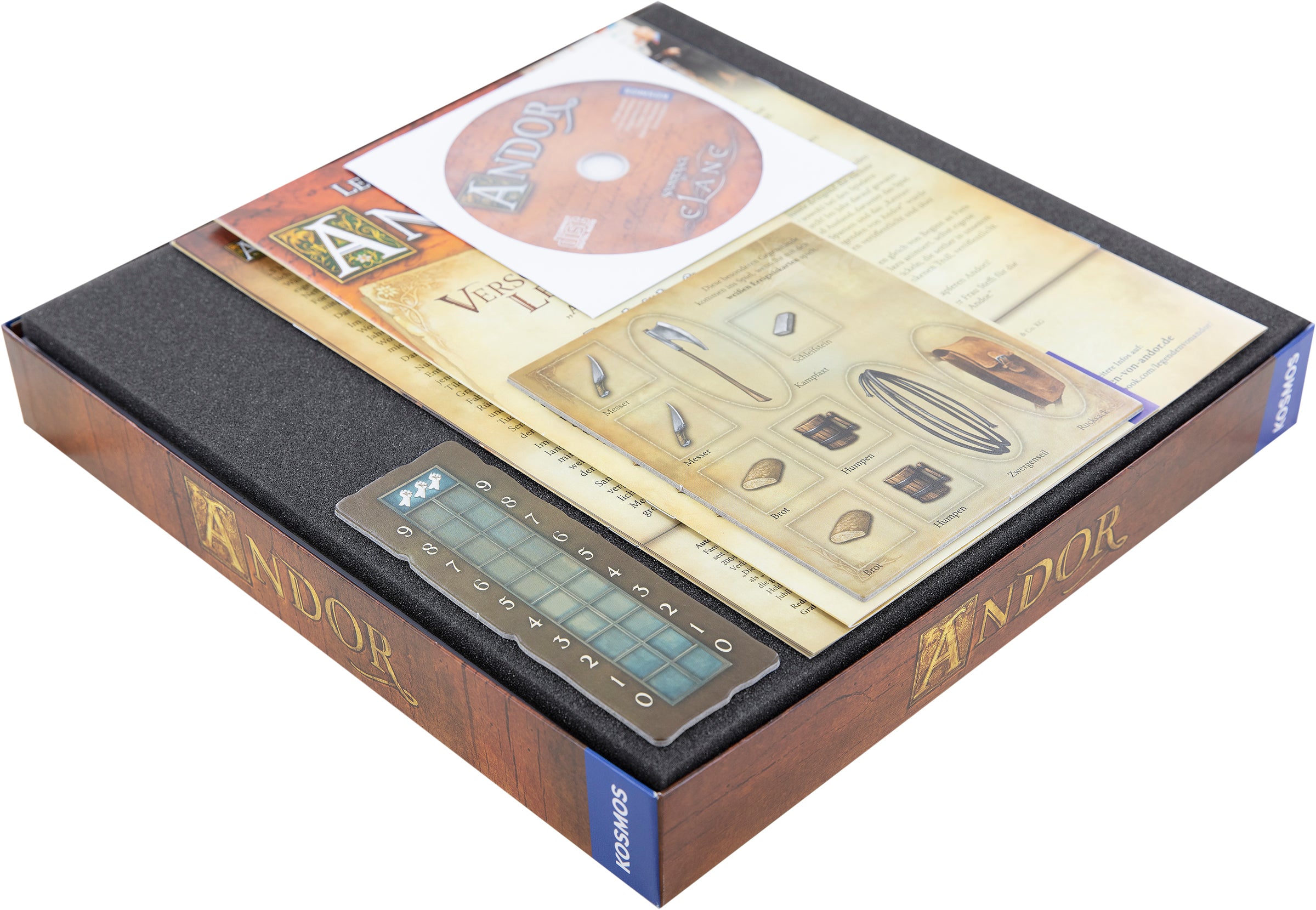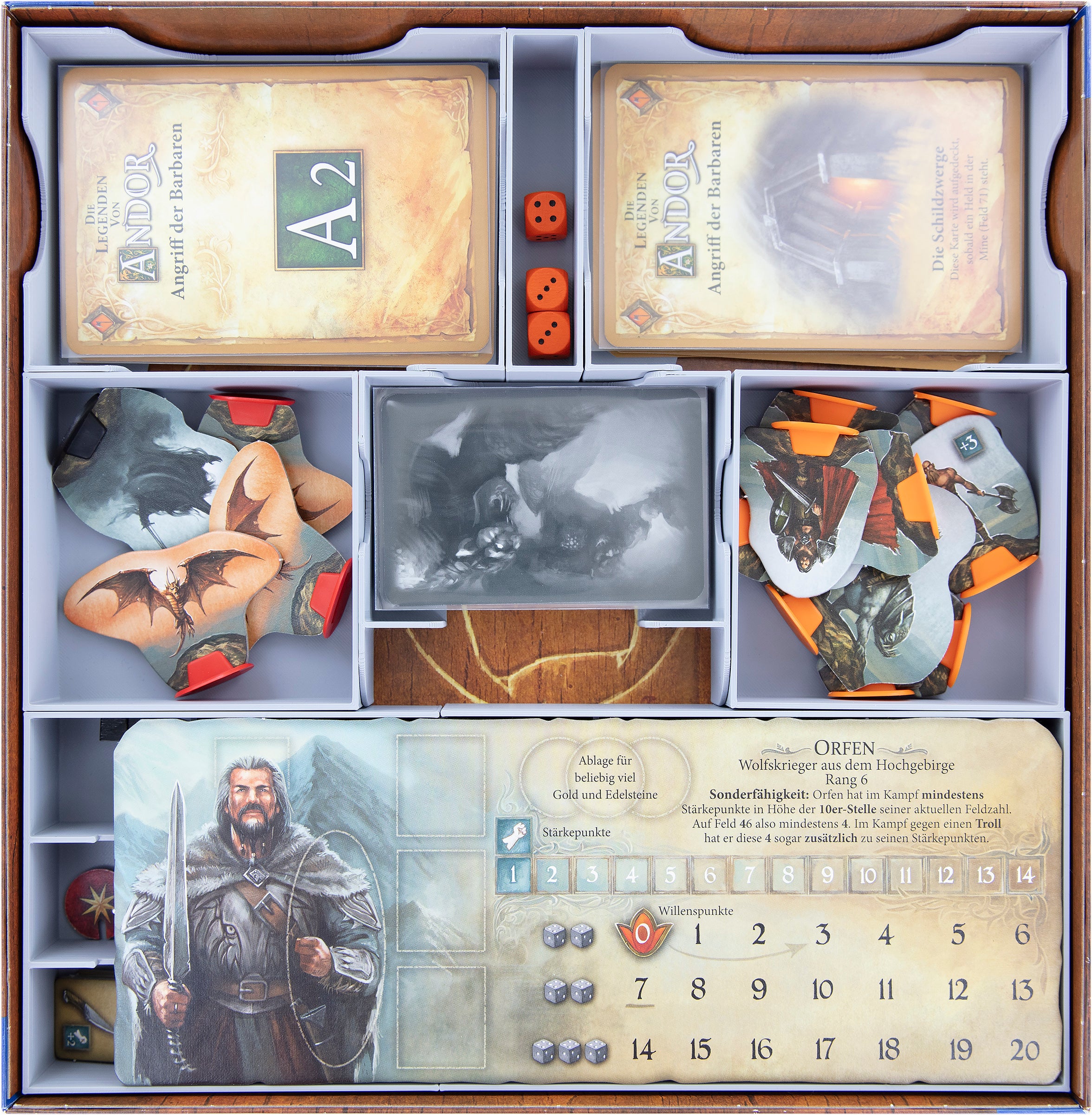 The Bonus Box adds four new legends, a new hero, a soundtrack on CD, a new game variant and an indenpendet dice game to the Andor cycle. Our insert uses the available space not only for the new components, but also comes prepared for fan legends and more bonus heroes.