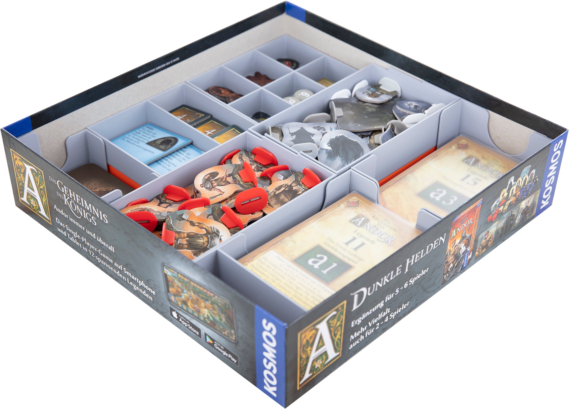 When the heroes return to Andor they find it desolate and pillaged. They embark on another journey to save the Andori. This big expansion does not need any components from the previous games and thus brings lots of components itself to the table. Once again our insert comes to the rescue and protects Andor from chaos.