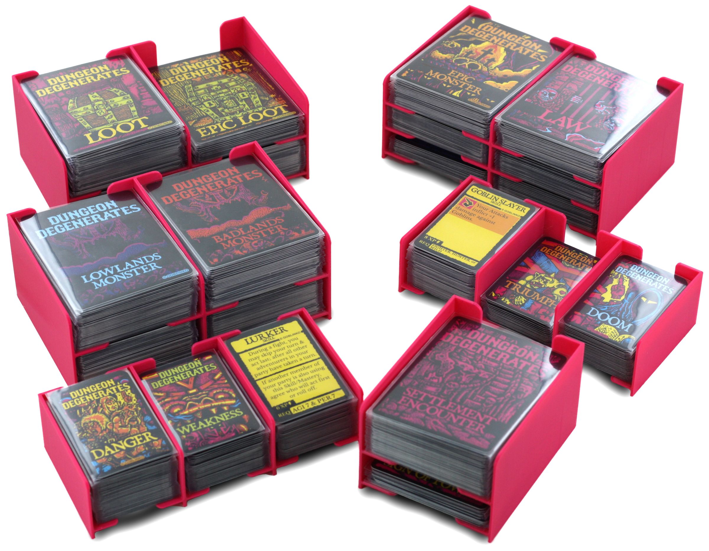 - 2 card holders, each with 4 compartments for regular-sized cards such as Monster Cards, Encounter Card, Law Monster Cards, Epic Monster Cards, Loot Cards, Epic Loot Cards