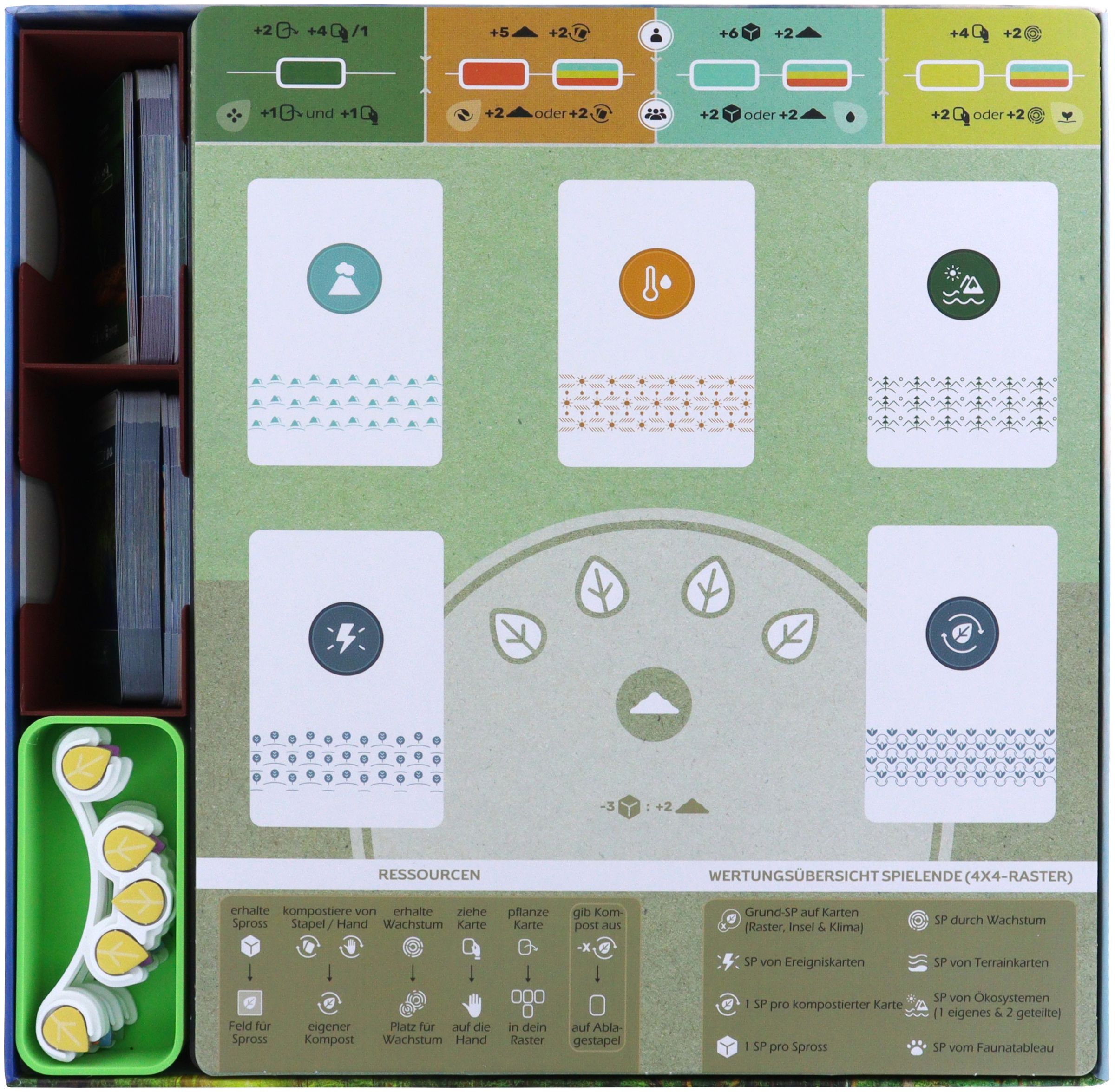 - One plastic card holder with two compartments (inner dimensions: 70 x 93 mm) for Fauna cards, Island cards, Climate cards, Solo game cards, and Ecosystem cards.