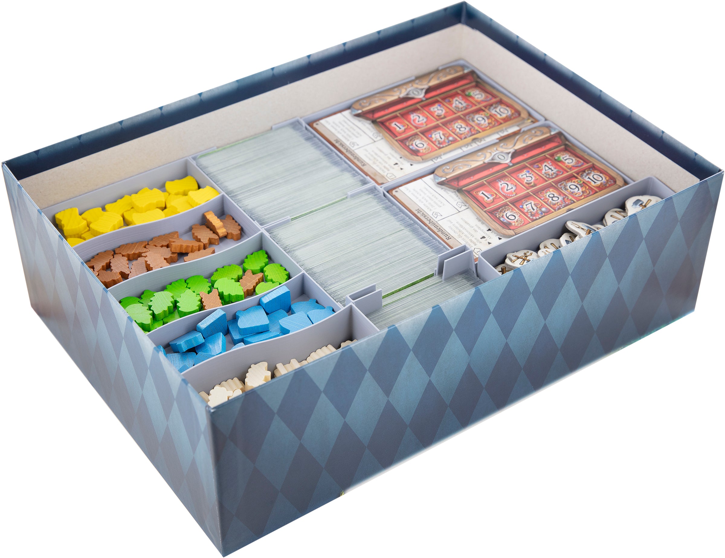 - The Organizer fits into the original board game box and offers space for the entire game material of the “Hallertau” core game.