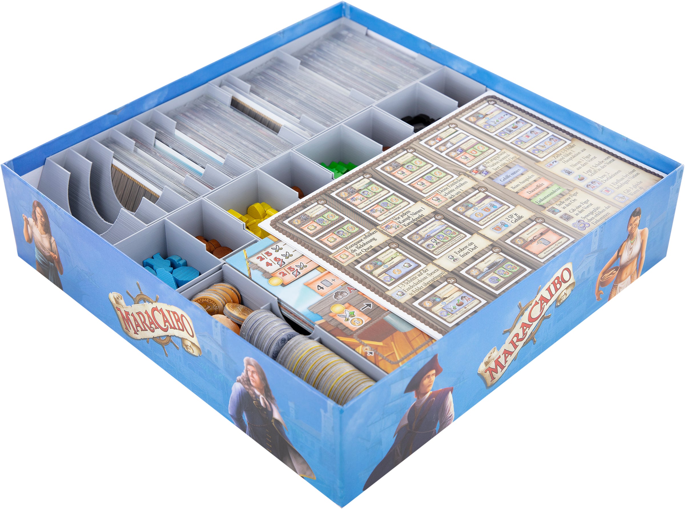 - The Organizer fits into the original board game box and provides space for the entire game material of Maracaibo.
