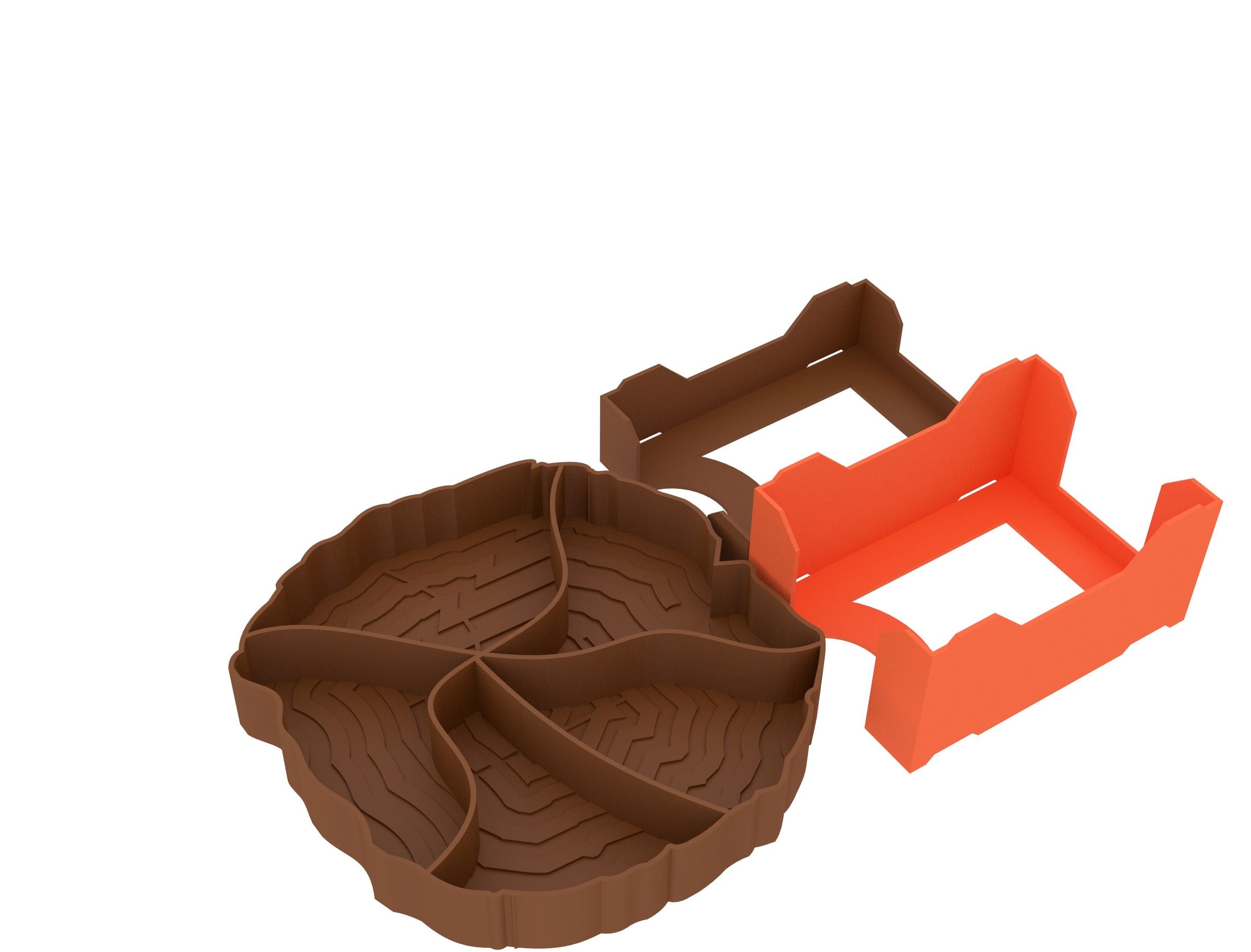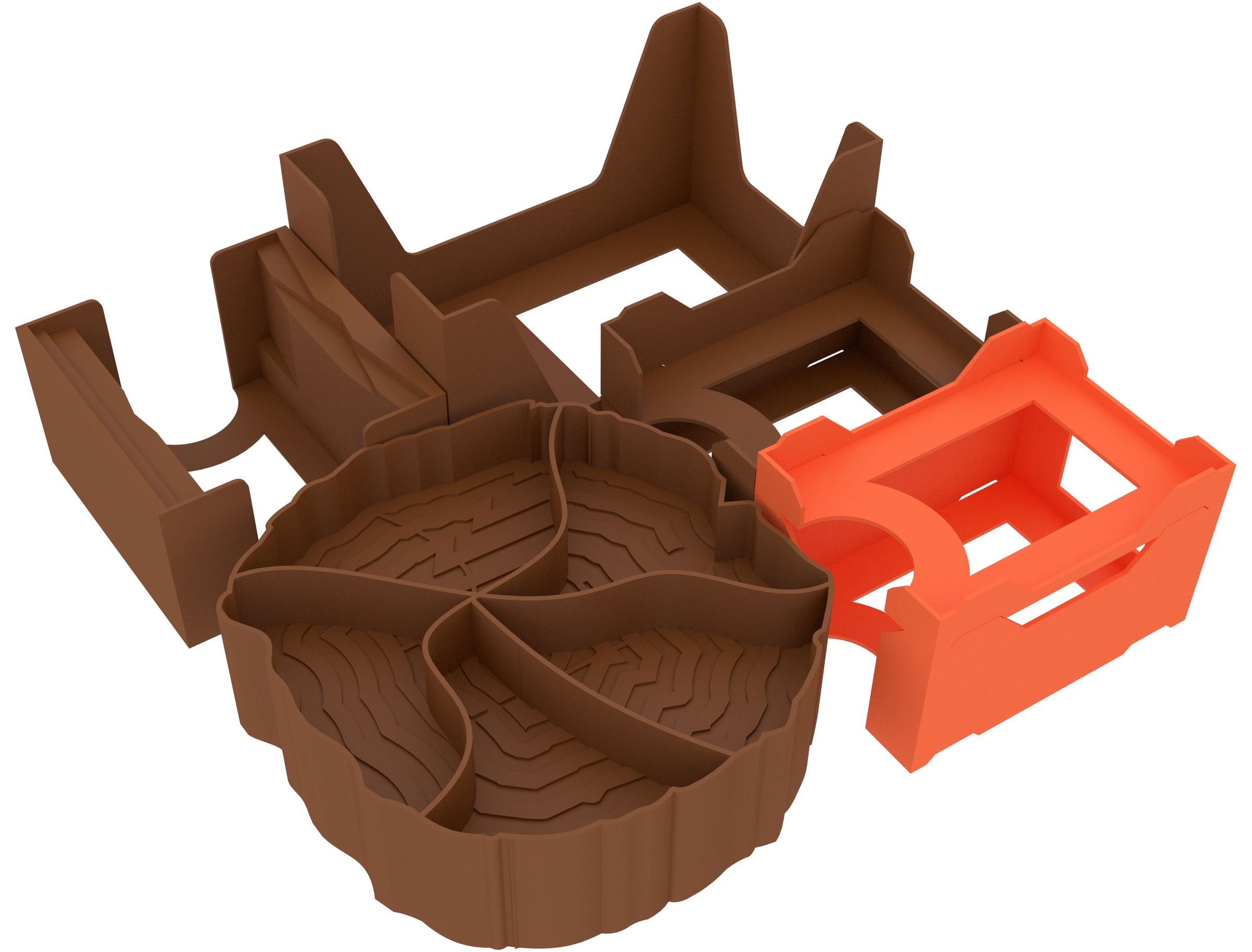 - 2 plastic tree stumps with seven compartments each for small-sized game material like tokens (Forest tokens, Mountain tokens, Sunshine tokens, Water tokens, Wildlife tokens)